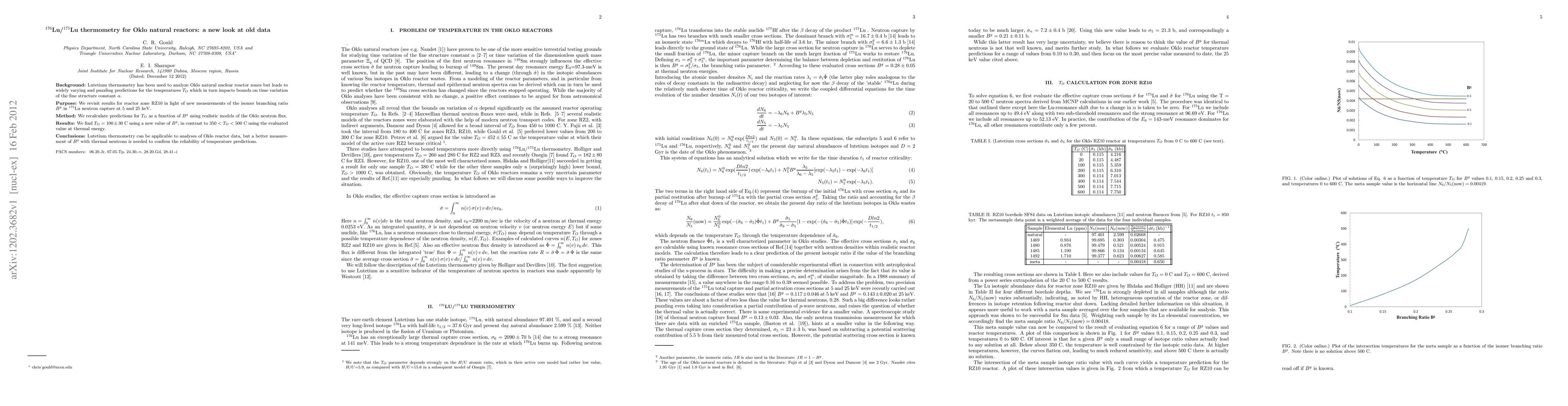 This paper revisits lutetium thermometry for Oklo natural reactors, finding $T_O = 100 \pm 30$ C using updated measurements of $B^g$ in $^{175}$Lu neutron capture, contrasting previous estimates of $350 < T_O < 500$ C. Better $B^g$ measurements are needed to confirm temperature predictions.