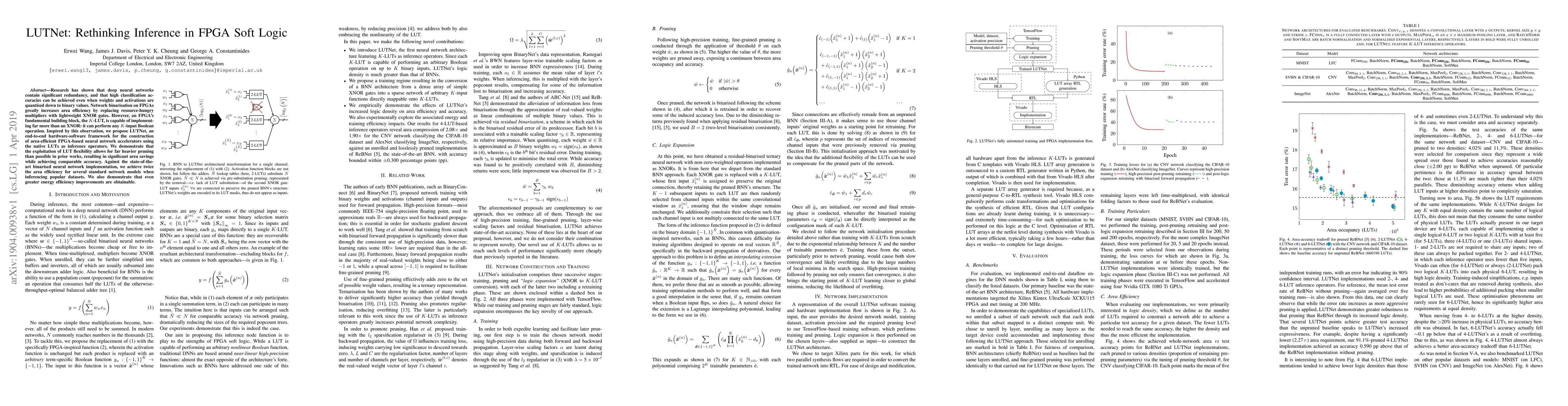 LUTNet proposes a novel framework for constructing area-efficient FPGA-based neural network accelerators by leveraging the flexibility of LUTs for inference operations, achieving twice the area efficiency compared to binarised neural networks while maintaining comparable accuracy. This approach enables heavier pruning and greater energy efficiency improvements.