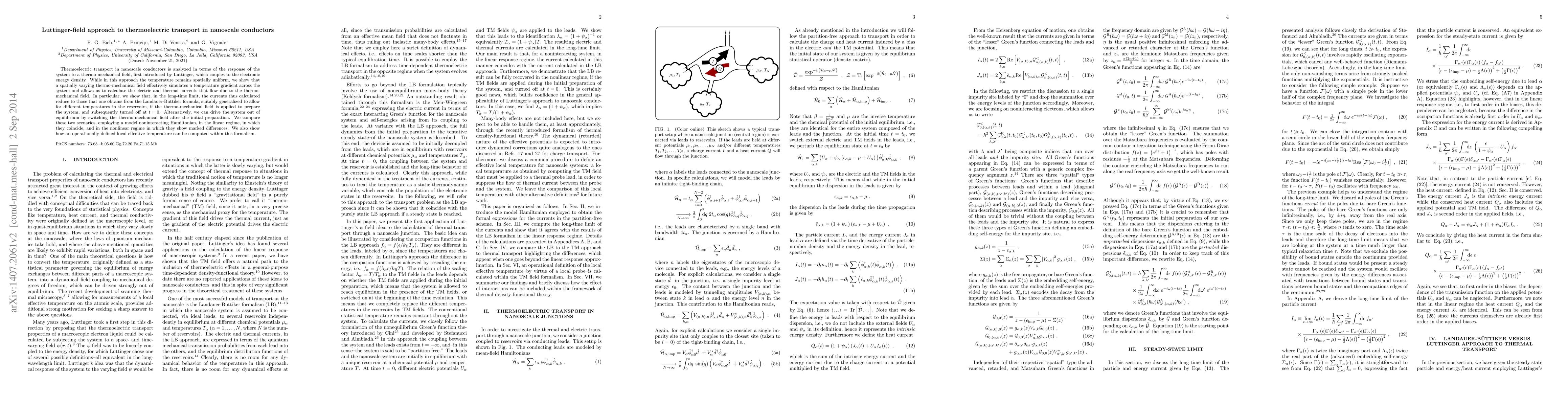 This paper employs the Luttinger-field approach to analyze thermoelectric transport in nanoscale conductors, demonstrating how a spatially varying thermo-mechanical field simulates a temperature gradient and calculates resulting electric and thermal currents. It compares equilibrium and nonequilibrium scenarios, revealing differences in the linear and nonlinear regimes.