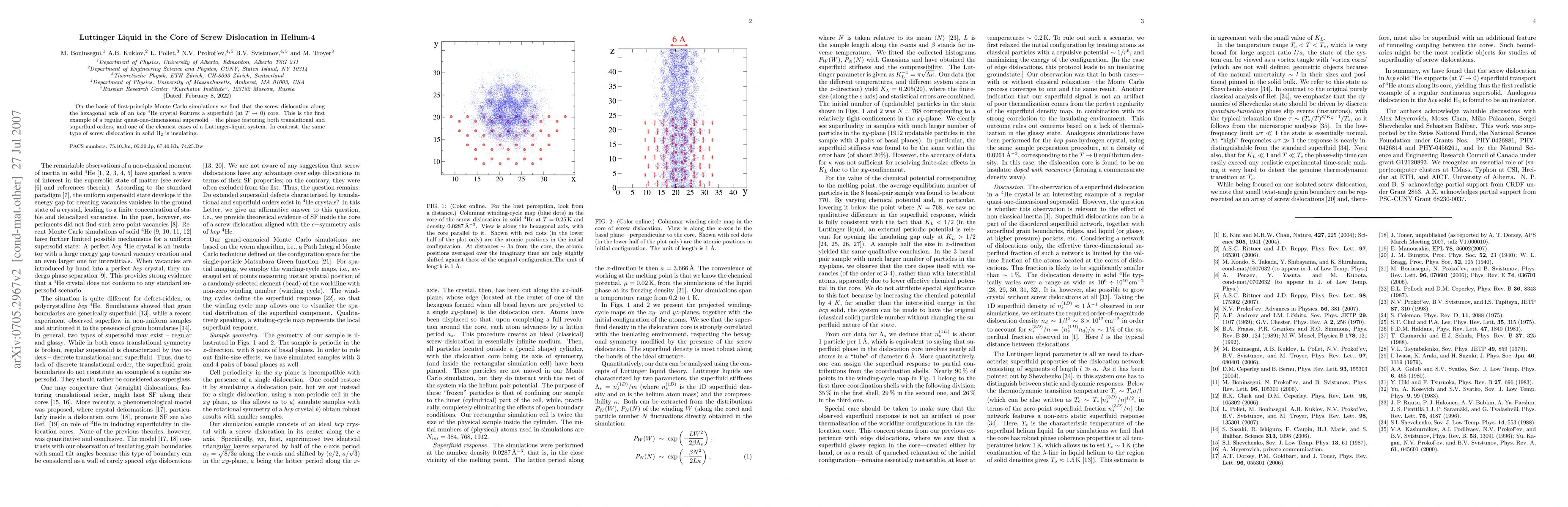 This study reveals that screw dislocations in hcp Helium-4 crystals exhibit a superfluid core, demonstrating a quasi-one-dimensional supersolid and a clean Luttinger-liquid system, unlike the insulating behavior found in solid Hydrogen. First-principle Monte Carlo simulations underpin these findings.