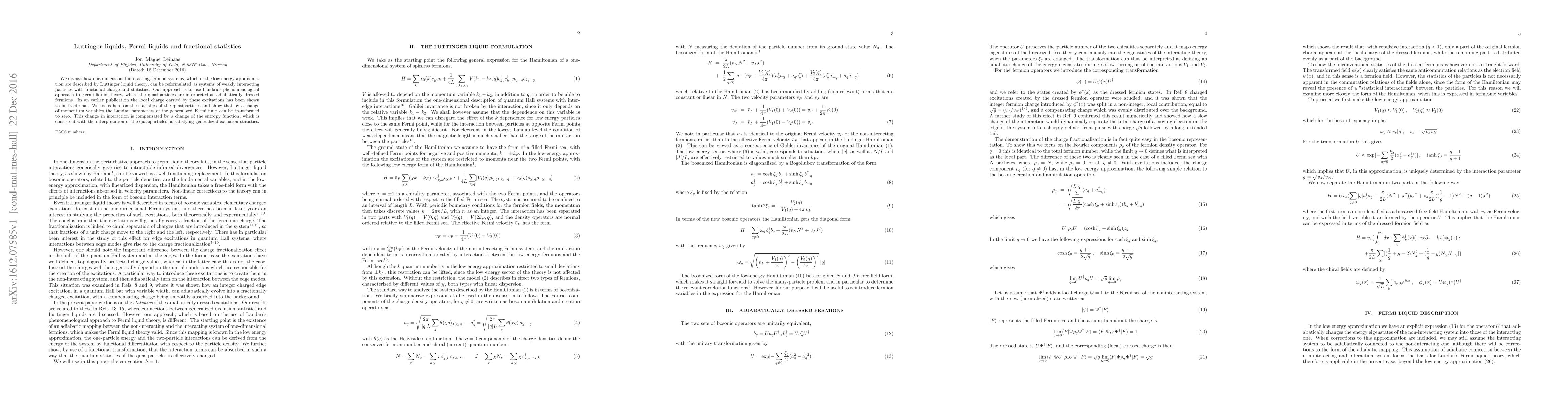 This paper reformulates one-dimensional interacting fermion systems using Luttinger liquid theory, reinterpreting them as weakly interacting particles with fractional charge and statistics, akin to Landau's Fermi liquid theory. It demonstrates how quasiparticles satisfy generalized exclusion statistics through a change of momentum variables.
