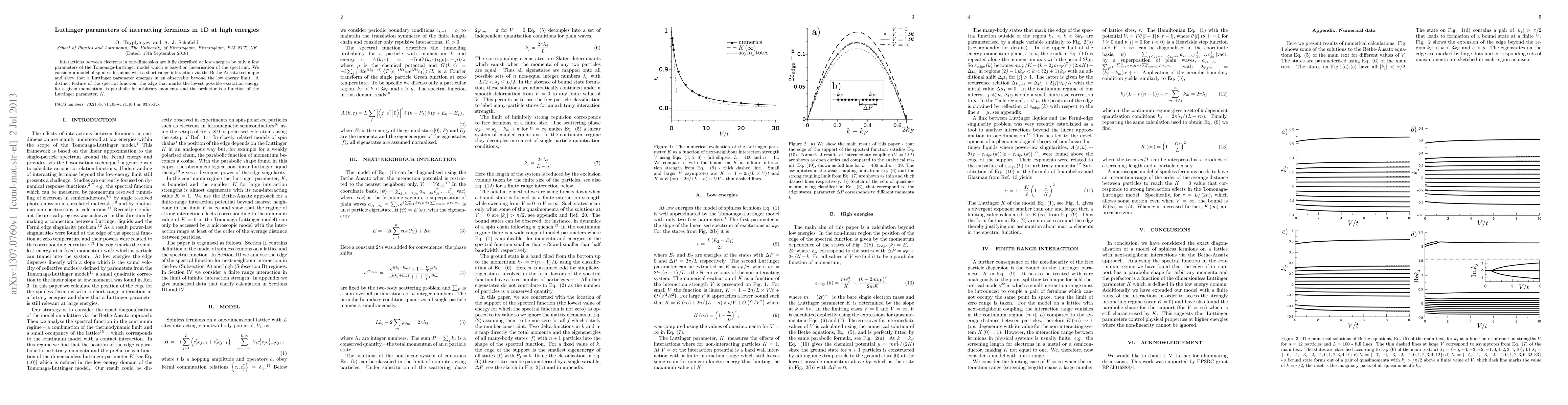 This paper explores the Luttinger parameters of interacting fermions in 1D at high energies, demonstrating that the Luttinger parameter influences the spectral function's edge, which is parabolic and dependent on the parameter K, extending beyond the low energy limit.