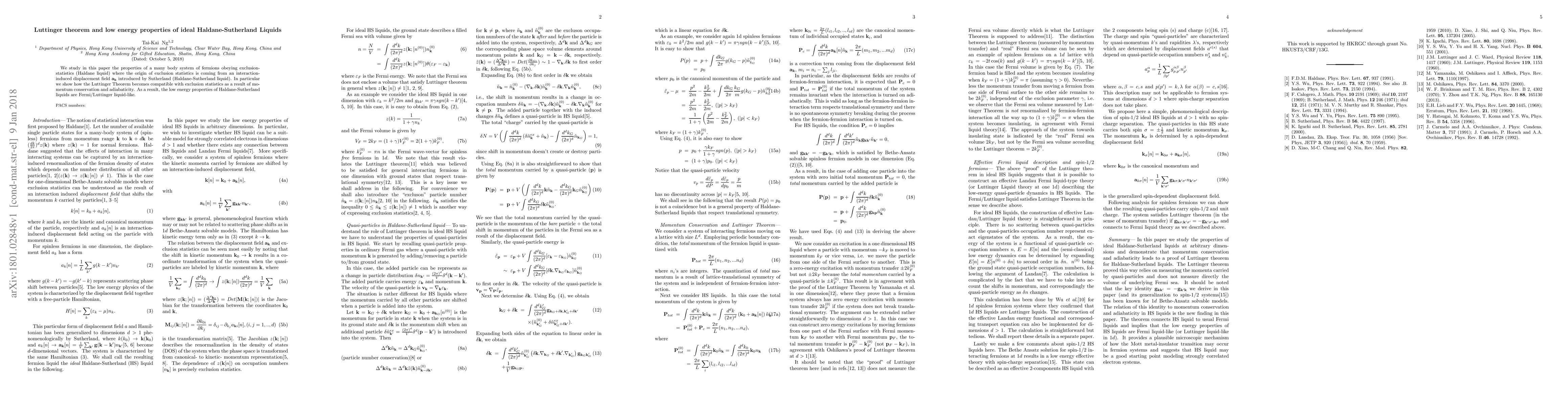 This paper investigates the low energy properties of Haldane-Sutherland liquids, demonstrating how the Luttinger Theorem aligns with exclusion statistics due to momentum conservation and adiabaticity, leading to Fermi/Luttinger liquid-like behavior in these many-body fermion systems.