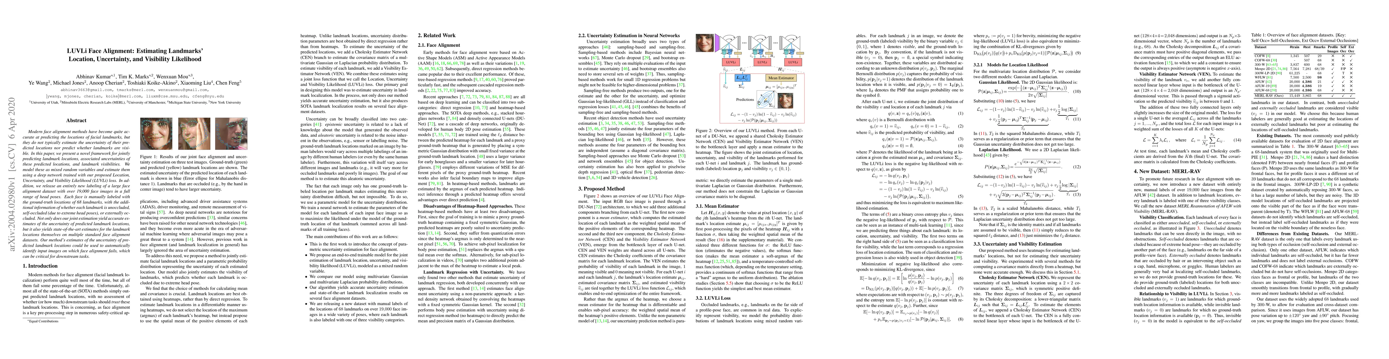 This paper introduces a novel framework for estimating facial landmark locations, their associated uncertainties, and visibility likelihoods using a deep network with a proposed LUVLi loss. It also provides a new, extensively labeled dataset for training and evaluation, achieving state-of-the-art results in landmark location prediction and uncertainty estimation.