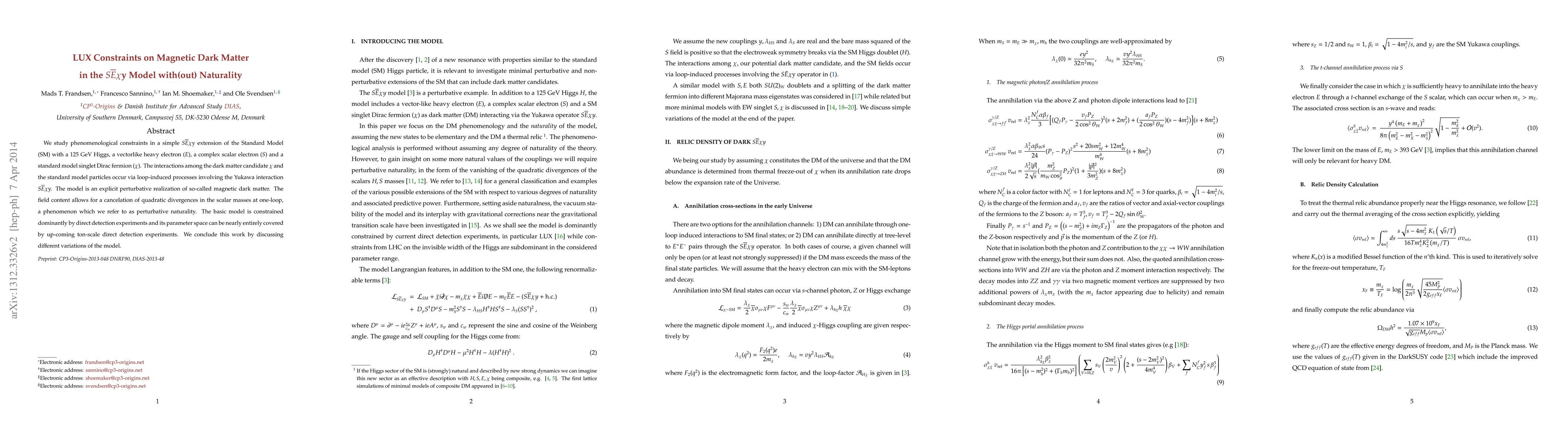 We study phenomenological constraints in a simple $S\bar{E} \chi$y extension of the Standard Model (SM) with a 125 GeV Higgs, a vector-like heavy electron $(E)$, a complex scalar electron $(S)$ and a standard model singlet Dirac fermion $(\chi)$. The interactions among the dark matter candidate $\chi$ and the standard model particles occur via loop-induced processes involving the Yukawa interaction $S\bar{E} \chi$y. The model is an explicit perturbative realization of so-called magnetic dark matter. The field content allows for a cancelation of quadratic divergences in the scalar masses at one-loop, a phenomenon which we refer to as perturbative naturality. The basic model is constrained dominantly by direct detection experiments and its parameter space can be nearly entirely covered by up-coming ton-scale direct detection experiments. We conclude this work by discussing different variations of the model.