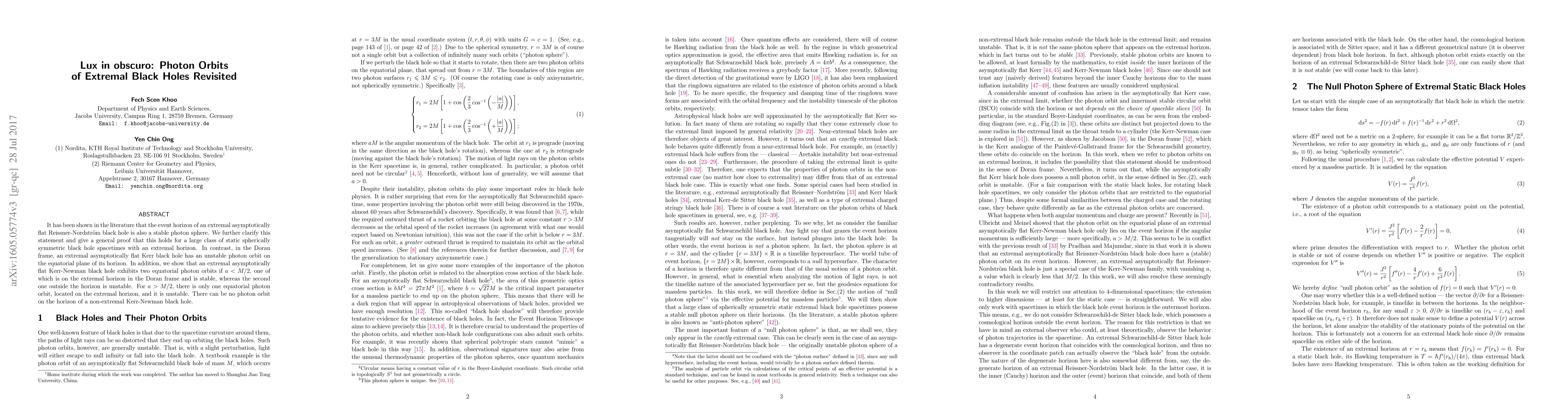 This paper revisits photon orbits around extremal black holes, proving that the event horizon of an extremal Reissner-Nordstrom black hole is a stable photon sphere. It also examines Kerr and Kerr-Newman black holes, finding that extremal Kerr black holes have unstable photon orbits, while Kerr-Newman black holes exhibit different behaviors depending on the parameter a relative to M.