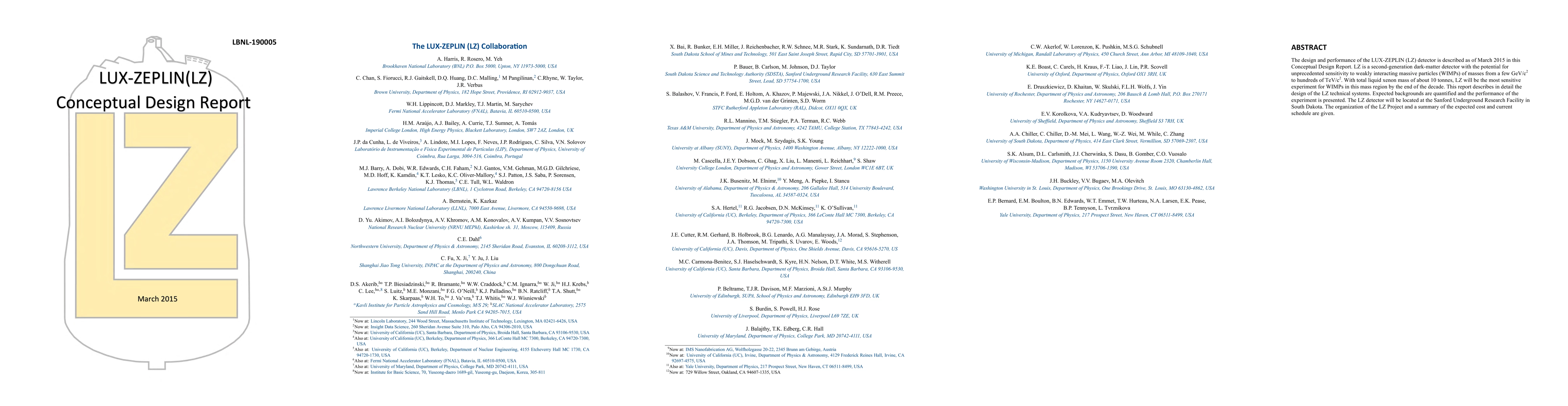 The LUX-ZEPLIN (LZ) Conceptual Design Report outlines the detailed design and anticipated performance of the LZ dark-matter detector, aiming for unprecedented sensitivity to WIMPs, with a total liquid xenon mass of 10 tonnes, and expected to be the most sensitive experiment for WIMPs by the end of the decade. The report also quantifies expected backgrounds and presents the project's organization, cost, and schedule.