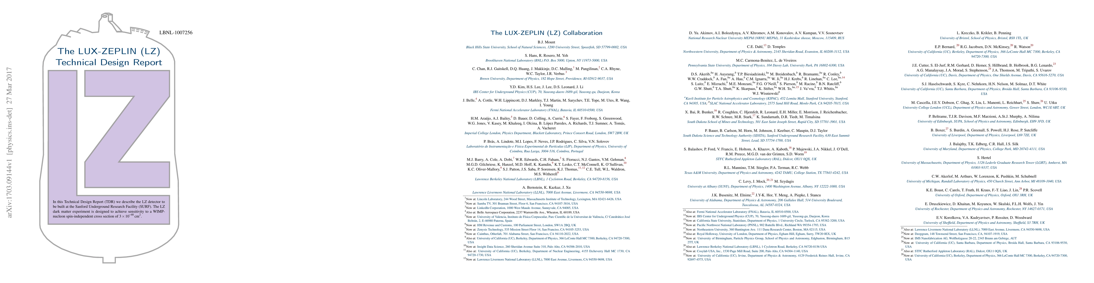 The LUX-ZEPLIN (LZ) Technical Design Report details the construction and design of the LZ detector at the Sanford Underground Research Facility, aimed at achieving high sensitivity for detecting dark matter through WIMP-nucleon interactions. The experiment targets a spin-independent cross section of 3 x 10^-48 cm².
