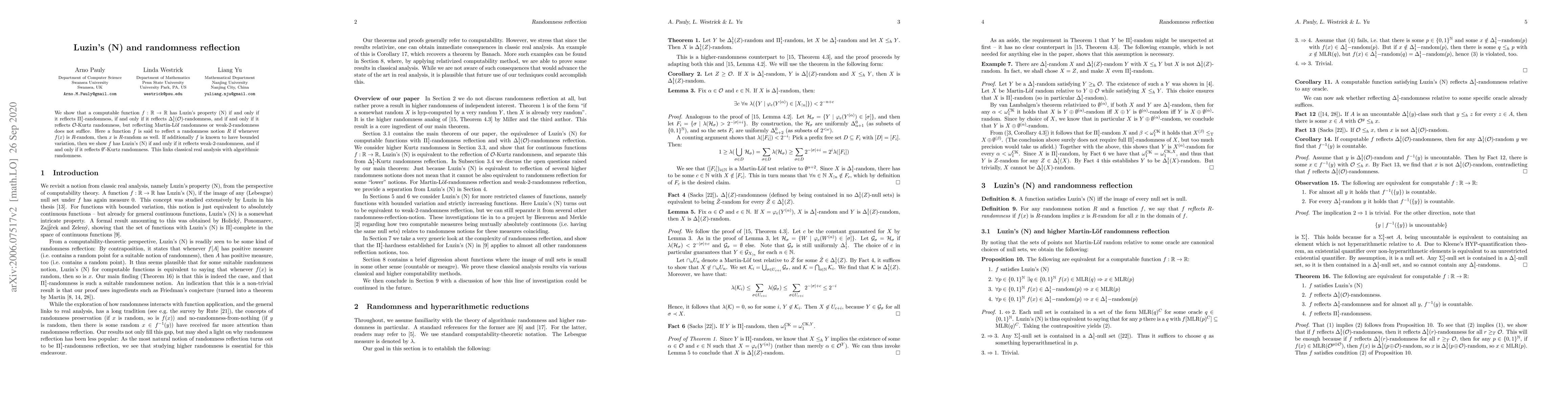 A research paper establishes connections between classical real analysis and algorithmic randomness, showing that a computable function has Luzin's (N) property if and only if it reflects certain randomness notions.