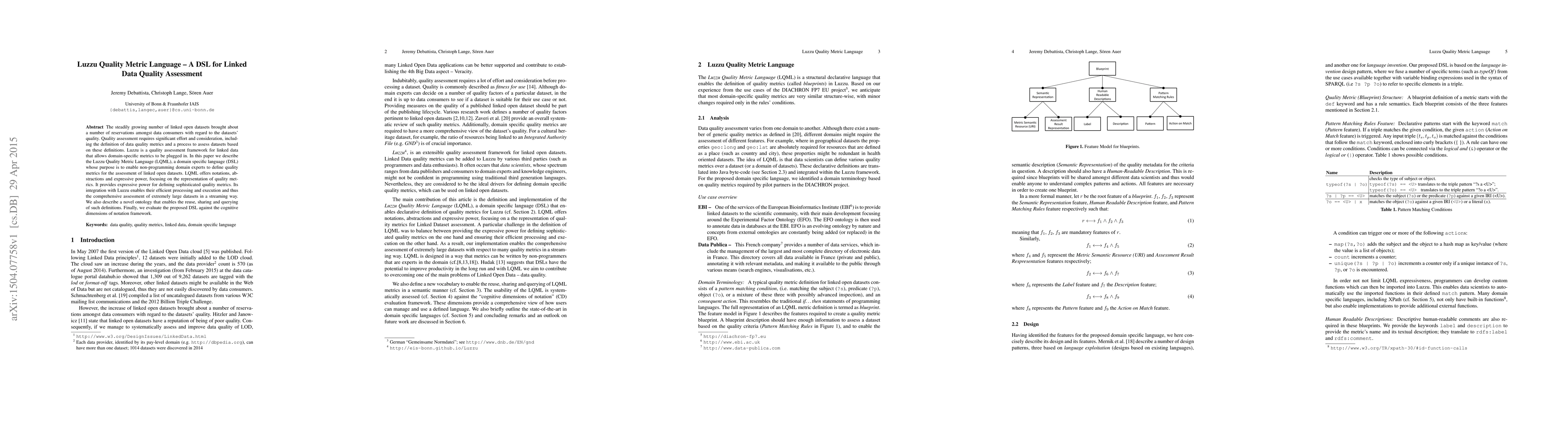 The paper introduces Luzzu Quality Metric Language (LQML), a domain-specific language for defining and assessing quality metrics in linked open datasets. LQML, integrated with the Luzzu framework, enables efficient processing of large datasets in a streaming manner, and includes an ontology for sharing and reusing quality definitions. The evaluation is based on the cognitive dimensions of notation framework.