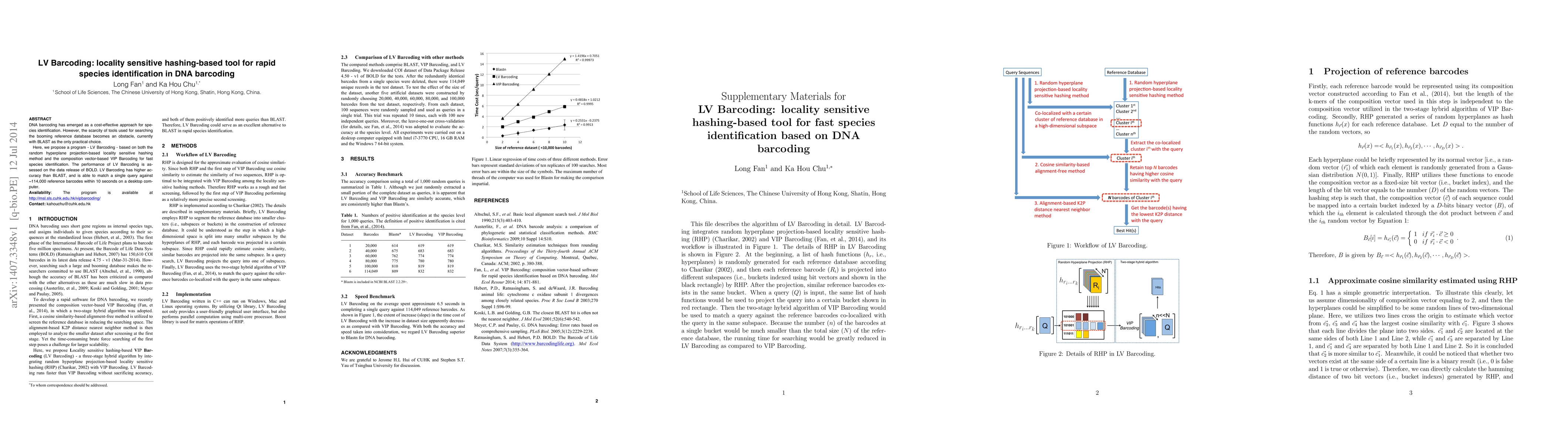 DNA barcoding has emerged as a cost-effective approach for species identification. However, the scarcity of tools used for searching the booming reference database becomes an obstacle, currently with BLAST as the only practical choice. Here, we propose a program - LV Barcoding - based on both the random hyperplane projection-based locality sensitive hashing method and the composition vector-based VIP Barcoding for fast species identification. The performance of LV Barcoding is assessed on the data release of BOLD. LV Barcoding has higher accuracy than BLAST, and is able to match a single query against ~114,000 reference barcodes within 10 seconds on a desktop computer. This program is available at http://msl.sls.cuhk.edu.hk/vipbarcoding/.