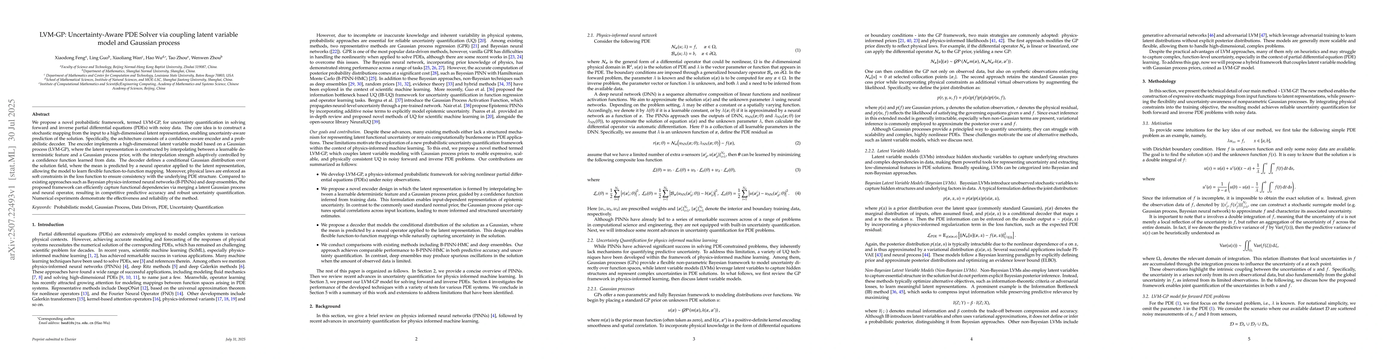 We propose a novel probabilistic framework, termed LVM-GP, for uncertainty quantification in solving forward and inverse partial differential equations (PDEs) with noisy data. The core idea is to construct a stochastic mapping from the input to a high-dimensional latent representation, enabling uncertainty-aware prediction of the solution. Specifically, the architecture consists of a confidence-aware encoder and a probabilistic decoder. The encoder implements a high-dimensional latent variable model based on a Gaussian process (LVM-GP), where the latent representation is constructed by interpolating between a learnable deterministic feature and a Gaussian process prior, with the interpolation strength adaptively controlled by a confidence function learned from data. The decoder defines a conditional Gaussian distribution over the solution field, where the mean is predicted by a neural operator applied to the latent representation, allowing the model to learn flexible function-to-function mapping. Moreover, physical laws are enforced as soft constraints in the loss function to ensure consistency with the underlying PDE structure. Compared to existing approaches such as Bayesian physics-informed neural networks (B-PINNs) and deep ensembles, the proposed framework can efficiently capture functional dependencies via merging a latent Gaussian process and neural operator, resulting in competitive predictive accuracy and robust uncertainty quantification. Numerical experiments demonstrate the effectiveness and reliability of the method.