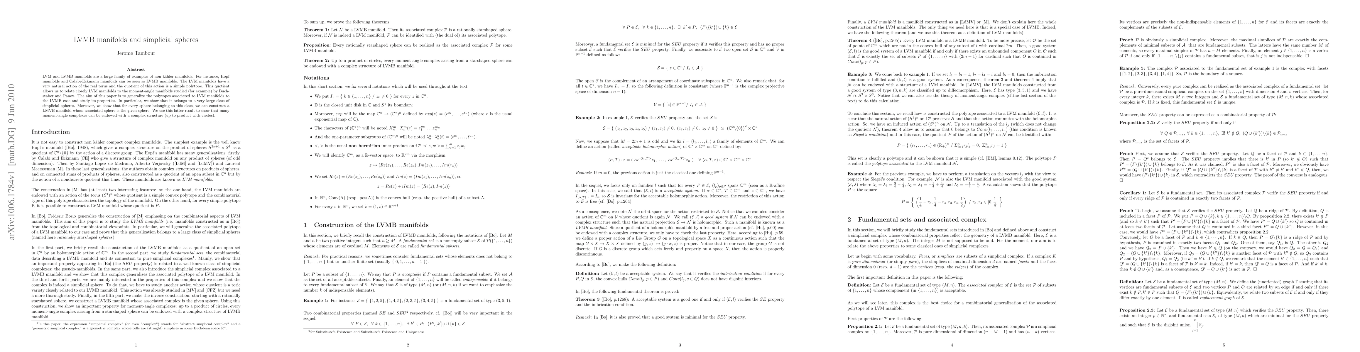 LVM and LVMB manifolds are a large family of examples of non kahler manifolds. For instance, Hopf manifolds and Calabi-Eckmann manifolds can be seen as LVMB manifolds. The LVM manifolds have a very natural action of the real torus and the quotient of this action is a simple polytope. This quotient allows us to relate closely LVM manifolds to the moment-angle manifolds studied (for example) by Buchstaber and Panov. The aim of this paper is to generalize the polytopes associated to LVM manifolds to the LVMB case and study its properties. In particular, we show that it belongs to a very large class of simplicial spheres. Moreover, we show that for every sphere belonging to this class, we can construct a LMVB manifold whose associated sphere is the given sphere. We use this latter result to show that many moment-angle complexes can be endowed with a complex structure (up to product with circles).