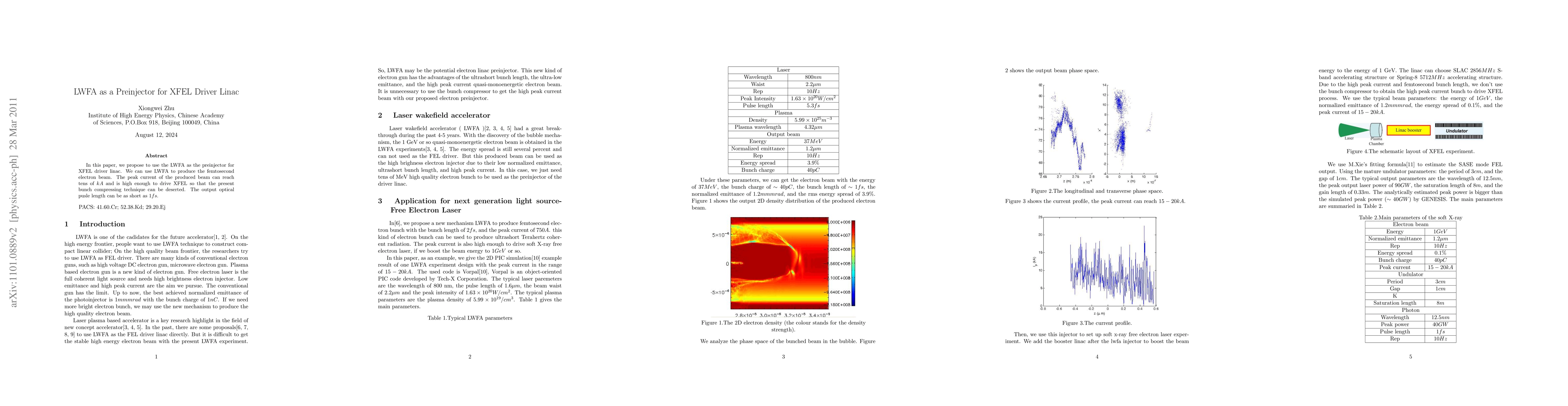 This paper proposes using Laser Wakefield Acceleration (LWFA) as a preinjector for the XFEL driver linac to produce femtosecond electron beams with peak currents of tens of kA, potentially eliminating the need for current bunch compressing techniques. The LWFA can achieve optical pulse lengths as short as 1 fs.