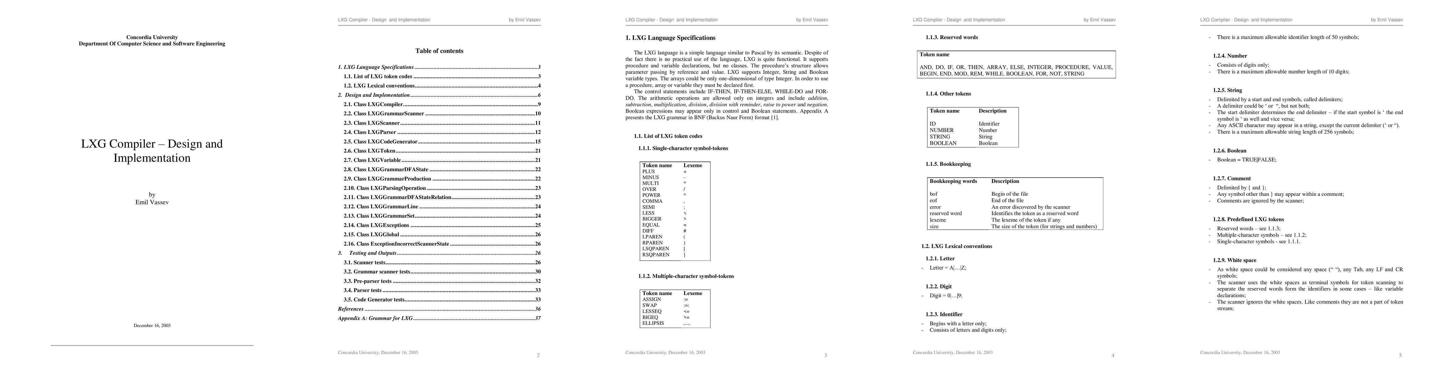 This paper details the design and implementation of an LXG compiler for a simple Pascal-like functional programming language, focusing on procedure and variable declarations, with no class support. Test results validate the compiler's effectiveness.