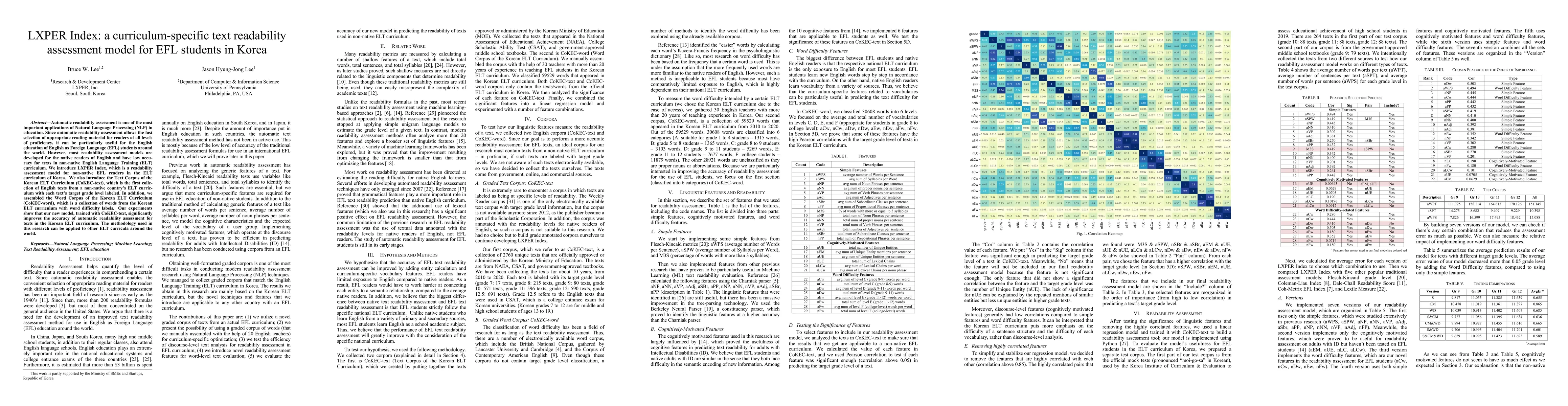 The LXPER Index is a new readability assessment model tailored for EFL students in Korea's English Language Training curriculum, improving accuracy over existing models for non-native English texts. Experiments demonstrate its effectiveness using the CoKEC-text corpus.