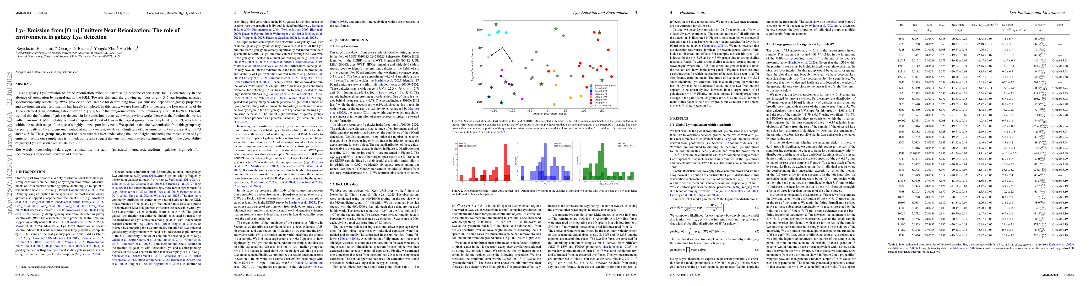 The paper presents a detailed analysis of Lyα emission in relation to galaxy environment using Keck LRIS observations, providing insights into the role of environment in Lyα detectability near reionization.