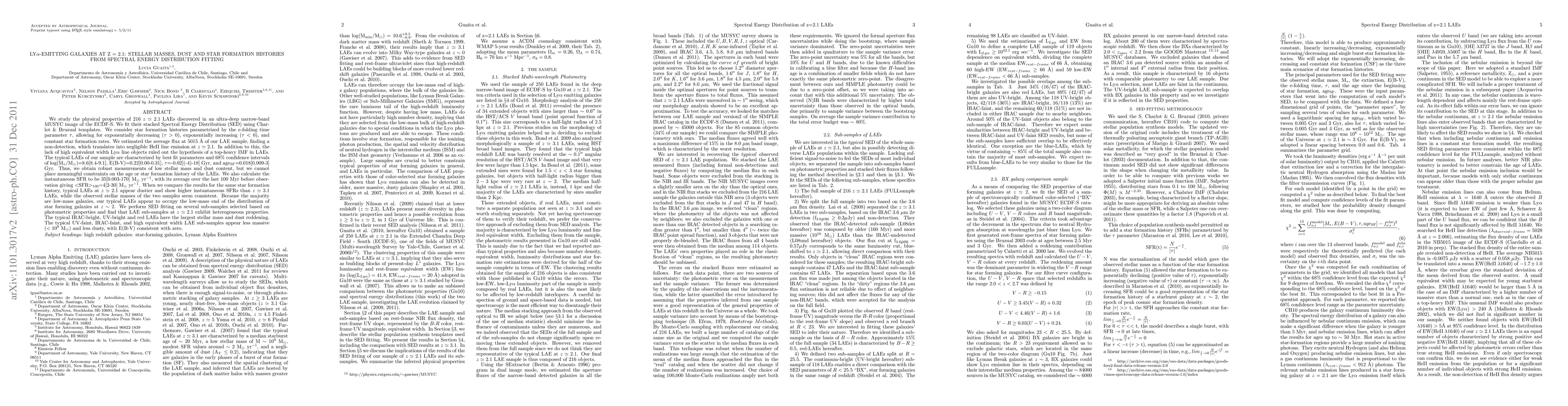 This paper investigates the physical properties of 216 Ly-alpha emitting galaxies (LAEs) at z ~ 2.1 using spectral energy distribution (SED) fitting. The study finds low stellar masses and dust content but lacks constraints on star formation history, with an average star formation rate of 4 M_sun/yr. The LAEs occupy the low-mass end of star-forming galaxies, showing heterogeneous properties among sub-samples.