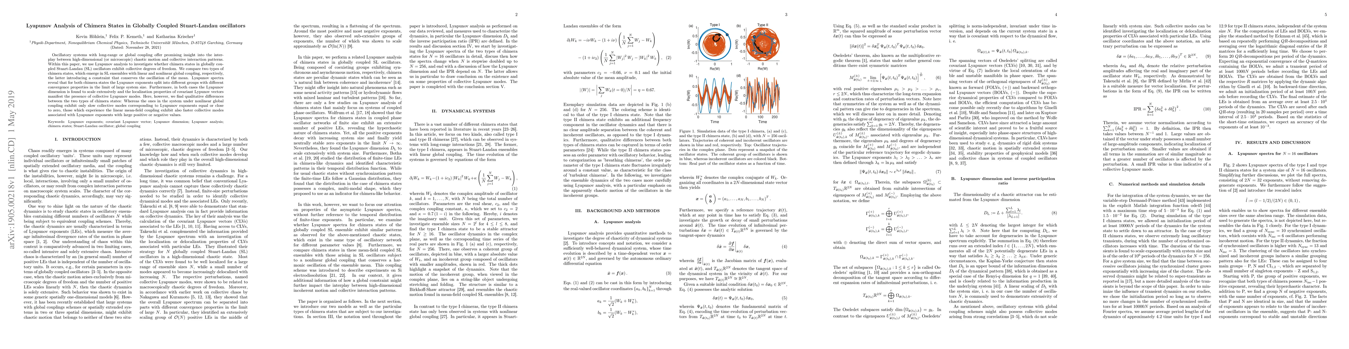 This paper uses Lyapunov analysis to explore chimera states in globally coupled Stuart-Landau oscillators, revealing distinct collective dynamics in chimera states under linear versus nonlinear global coupling. The Lyapunov dimension scales extensively, and while both types show collective modes, only the nonlinear coupling states exhibit slow modes with near-zero Lyapunov exponents.