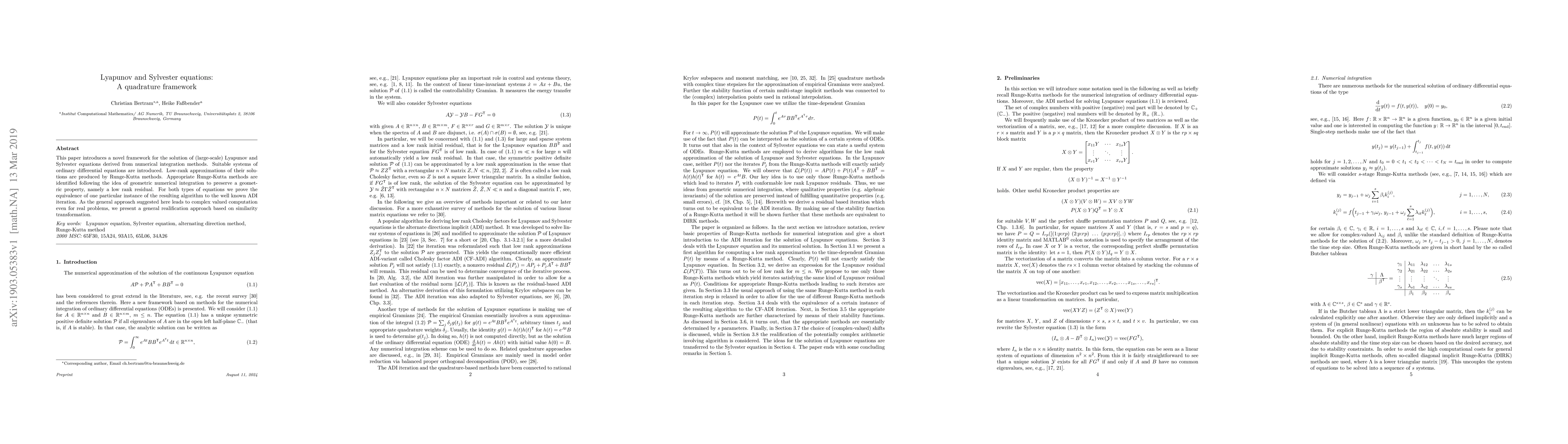 This paper proposes a new framework for solving large-scale Lyapunov and Sylvester equations using quadrature methods and Runge-Kutta techniques, ensuring low-rank approximations and geometric preservation. It also introduces a realification approach to handle complex computations arising from the method.