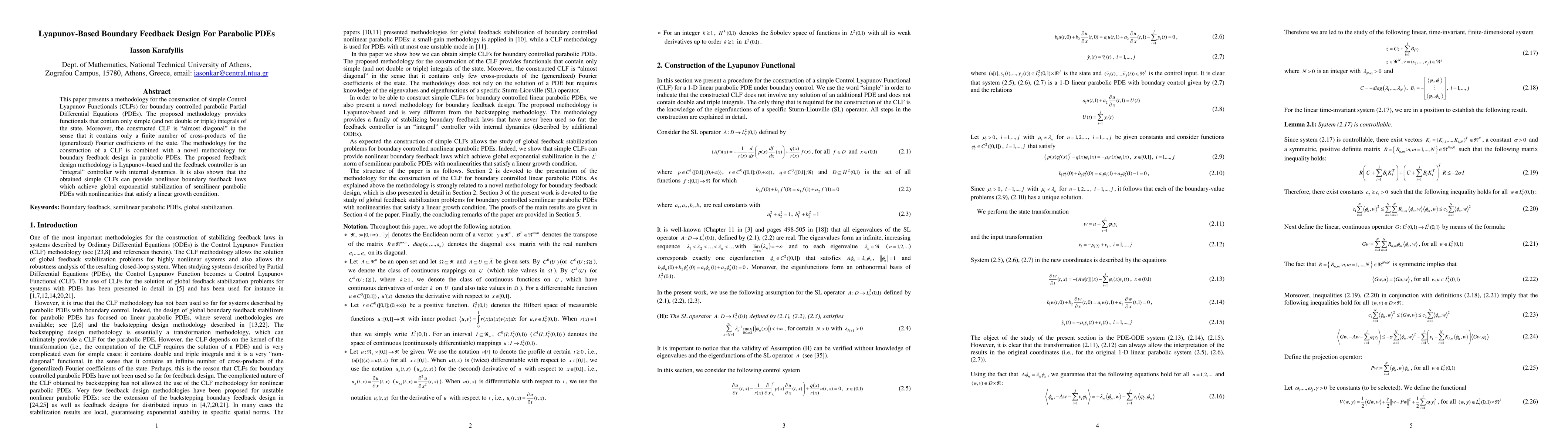 This paper develops a methodology for constructing simple Control Lyapunov Functionals for boundary controlled parabolic PDEs, leading to "almost diagonal" functionals with minimal cross-product terms. It also introduces a novel Lyapunov-based boundary feedback design that achieves global exponential stabilization for semilinear parabolic PDEs.