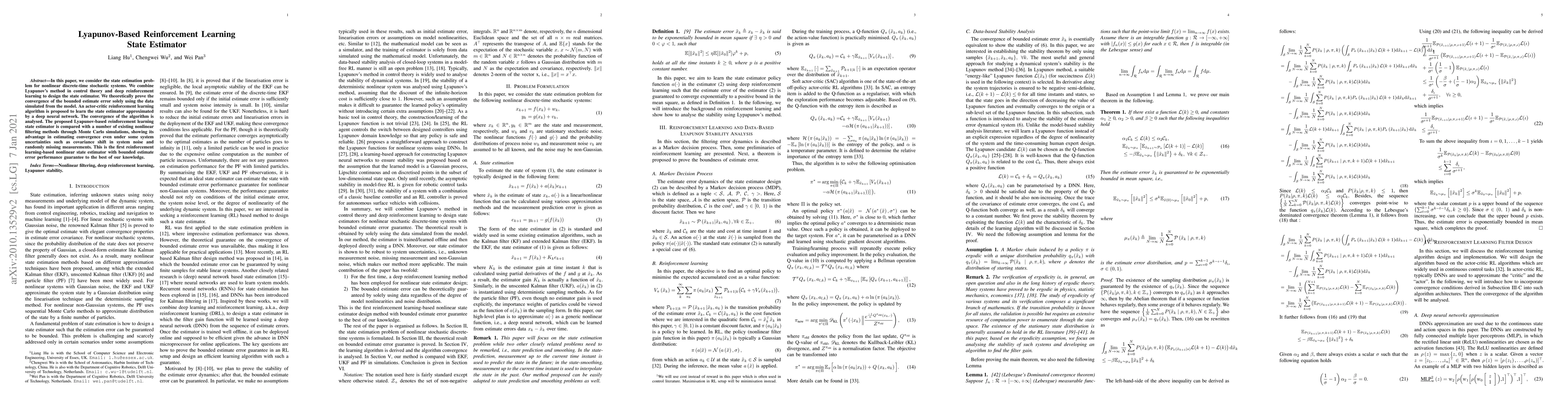 In this paper, we consider the state estimation problem for nonlinear stochastic discrete-time systems. We combine Lyapunov's method in control theory and deep reinforcement learning to design the state estimator. We theoretically prove the convergence of the bounded estimate error solely using the data simulated from the model. An actor-critic reinforcement learning algorithm is proposed to learn the state estimator approximated by a deep neural network. The convergence of the algorithm is analysed. The proposed Lyapunov-based reinforcement learning state estimator is compared with a number of existing nonlinear filtering methods through Monte Carlo simulations, showing its advantage in terms of estimate convergence even under some system uncertainties such as covariance shift in system noise and randomly missing measurements. To the best of our knowledge, this is the first reinforcement learning based nonlinear state estimator with bounded estimate error performance guarantee.