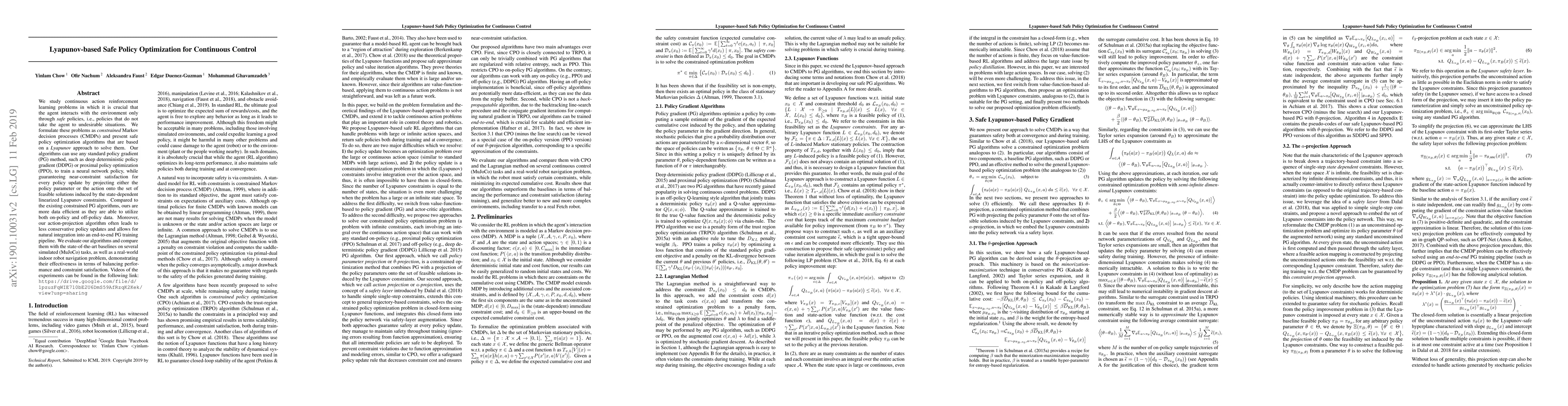 This paper proposes Lyapunov-based algorithms for safe policy optimization in continuous control reinforcement learning, ensuring agents avoid undesirable situations. The approach integrates with standard policy gradient methods, offering improved data efficiency and less conservative updates while maintaining constraint satisfaction.