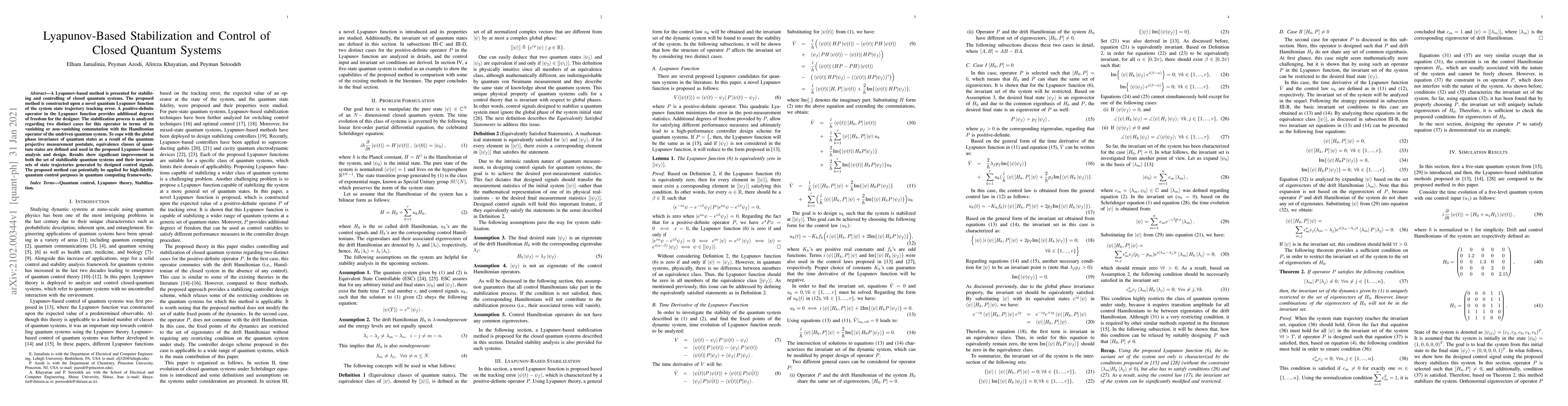 This paper introduces a Lyapunov-based method for stabilizing and controlling closed quantum systems using a novel quantum Lyapunov function, showing improved stabilizability and control over quantum states. The method addresses the global phase invariance issue and can enhance high-fidelity quantum control in computing frameworks.
