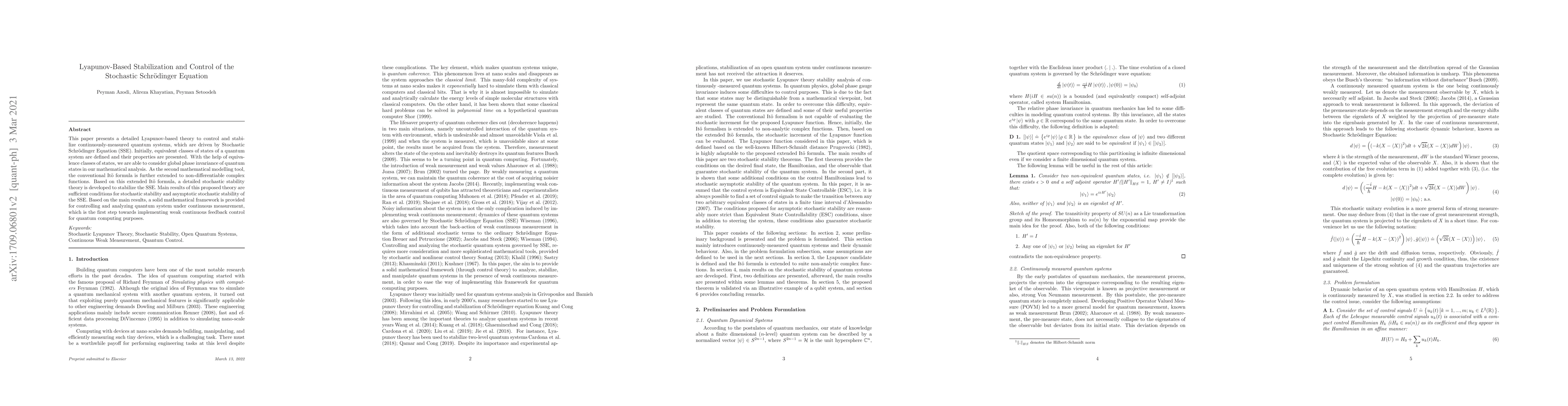 This paper presents a detailed Lyapunov-based theory to control and stabilize continuously-measured quantum systems, which are driven by Stochastic Schrodinger Equation (SSE). Initially, equivalent classes of states of a quantum system are defined and their properties are presented. With the help of equivalence classes of states, we are able to consider global phase invariance of quantum states in our mathematical analysis. As the second mathematical modelling tool, the conventional Ito formula is further extended to non-differentiable complex functions. Based on this extended Ito formula, a detailed stochastic stability theory is developed to stabilize the SSE. Main results of this proposed theory are sufficient conditions for stochastic stability and asymptotic stochastic stability of the SSE. Based on the main results, a solid mathematical framework is provided for controlling and analyzing quantum system under continuous measurement, which is the first step towards implementing weak continuous feedback control for quantum computing purposes.