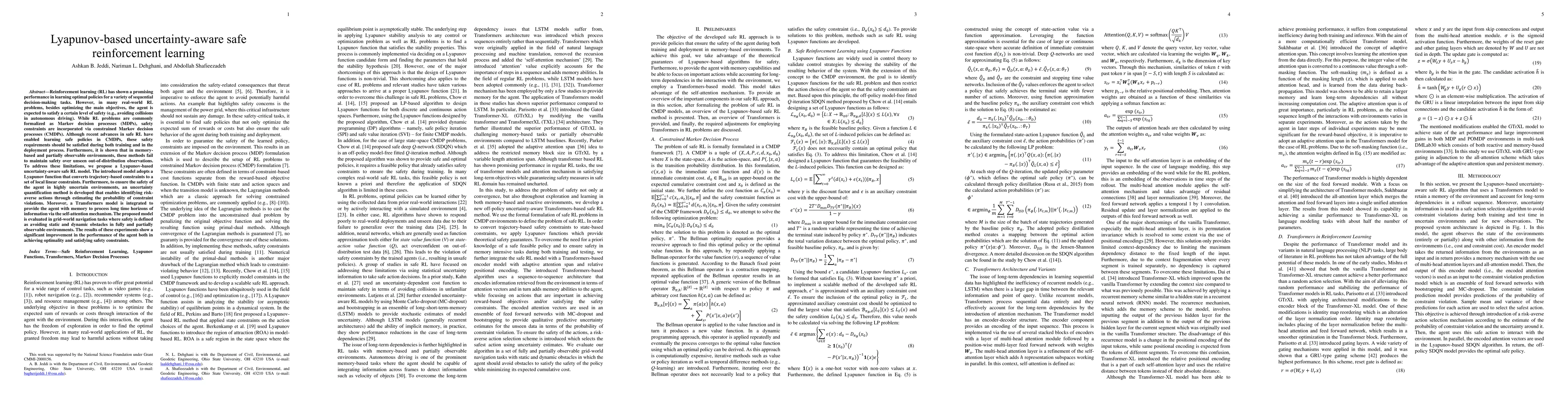 Reinforcement learning (RL) has shown a promising performance in learning optimal policies for a variety of sequential decision-making tasks. However, in many real-world RL problems, besides optimizing the main objectives, the agent is expected to satisfy a certain level of safety (e.g., avoiding collisions in autonomous driving). While RL problems are commonly formalized as Markov decision processes (MDPs), safety constraints are incorporated via constrained Markov decision processes (CMDPs). Although recent advances in safe RL have enabled learning safe policies in CMDPs, these safety requirements should be satisfied during both training and in the deployment process. Furthermore, it is shown that in memory-based and partially observable environments, these methods fail to maintain safety over unseen out-of-distribution observations. To address these limitations, we propose a Lyapunov-based uncertainty-aware safe RL model. The introduced model adopts a Lyapunov function that converts trajectory-based constraints to a set of local linear constraints. Furthermore, to ensure the safety of the agent in highly uncertain environments, an uncertainty quantification method is developed that enables identifying risk-averse actions through estimating the probability of constraint violations. Moreover, a Transformers model is integrated to provide the agent with memory to process long time horizons of information via the self-attention mechanism. The proposed model is evaluated in grid-world navigation tasks where safety is defined as avoiding static and dynamic obstacles in fully and partially observable environments. The results of these experiments show a significant improvement in the performance of the agent both in achieving optimality and satisfying safety constraints.