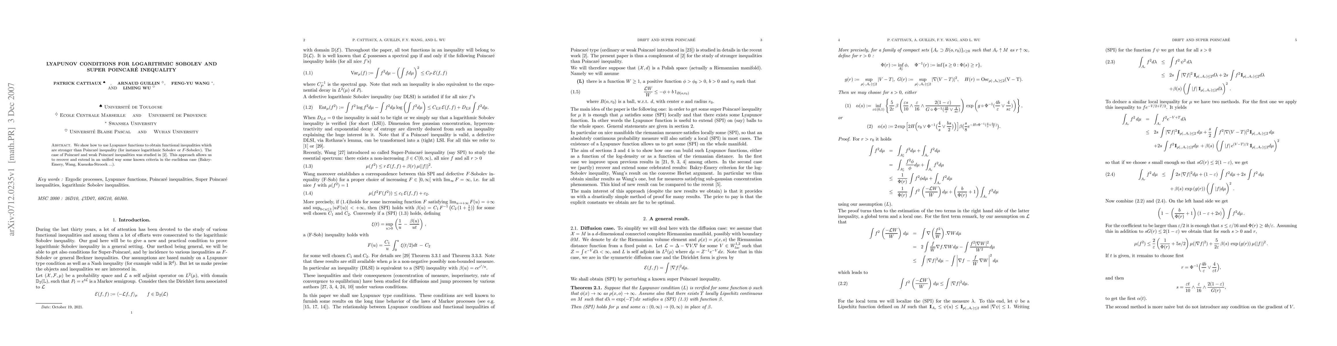 Summary: The paper demonstrates how Lyapunov functions can be utilized to derive functional inequalities like logarithmic Sobolev and $F$-Sobolev inequalities, which are stronger than the Poincaré inequality. This approach extends known criteria and provides a unified framework for studying these inequalities.