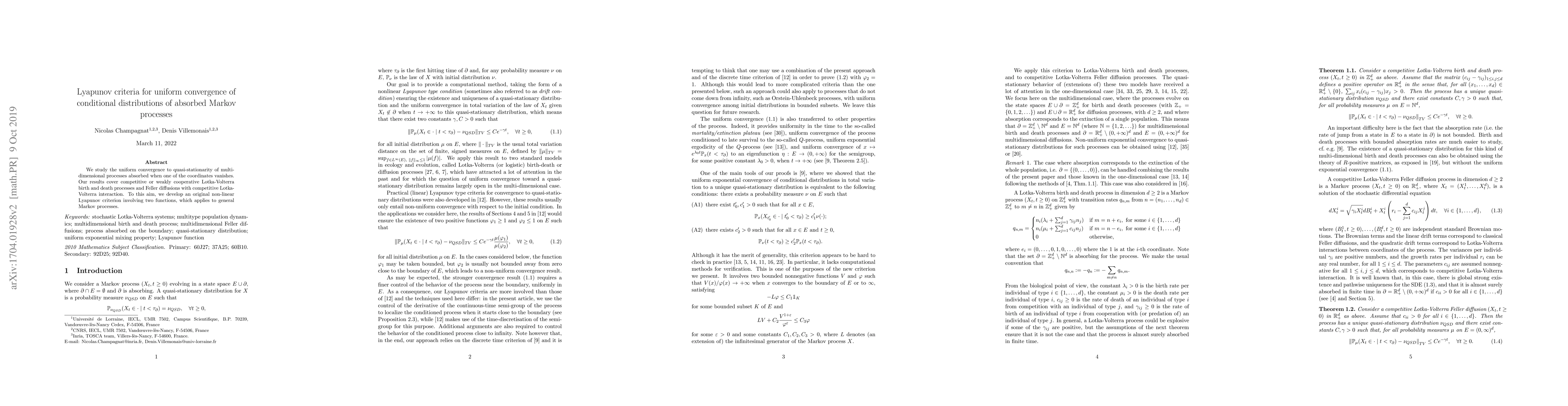 This paper develops novel Lyapunov criteria for the uniform convergence of conditional distributions in absorbed Markov processes, focusing on quasi-stationary behaviors in competitive or cooperative Lotka-Volterra models and Feller diffusions. The criteria utilize two Lyapunov functions to ensure applicability to general Markov processes.