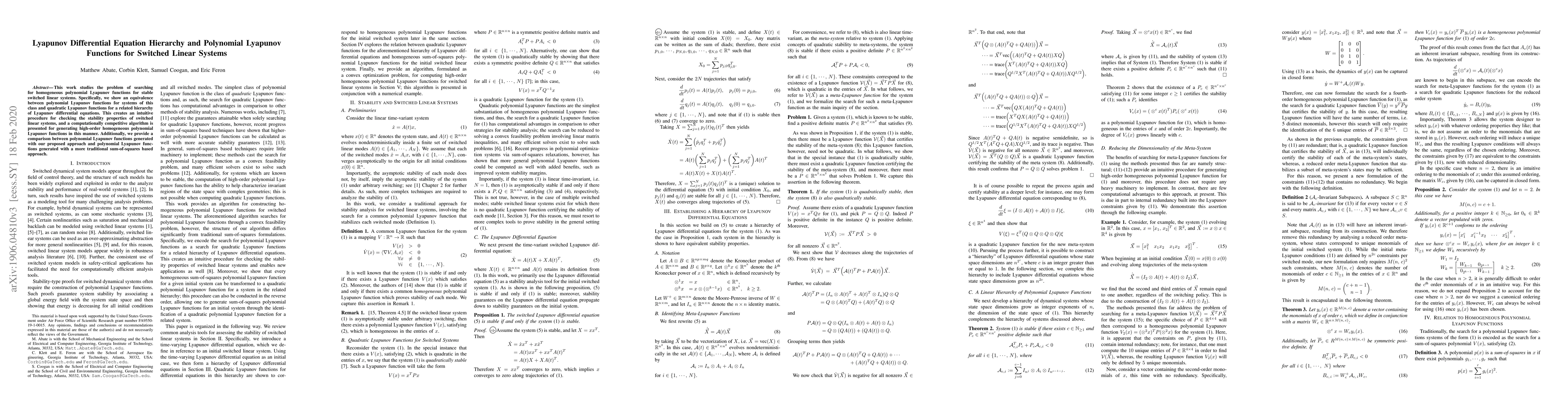 This paper explores the equivalence between polynomial Lyapunov functions for stable switched linear systems and quadratic Lyapunov functions derived from a hierarchy of Lyapunov differential equations. It proposes a computationally efficient algorithm for generating high-order homogeneous polynomial Lyapunov functions and compares its effectiveness with traditional sum-of-squares methods.