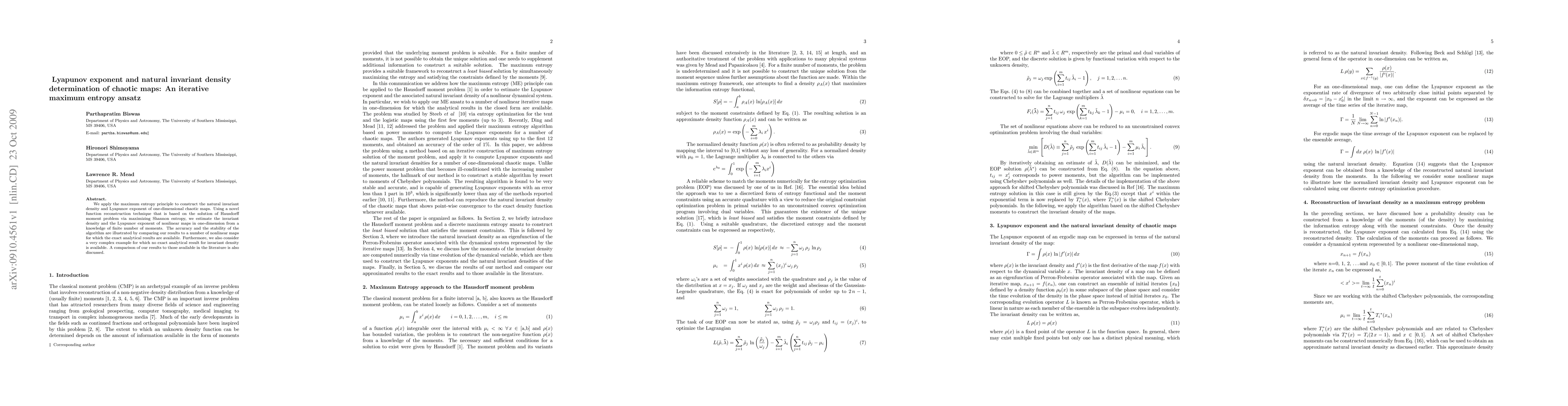 This paper applies the maximum entropy principle to determine the natural invariant density and Lyapunov exponent of one-dimensional chaotic maps using a novel iterative technique based on the Hausdorff moment problem. The method's accuracy and stability are demonstrated through comparisons with exact analytical results and complex examples.