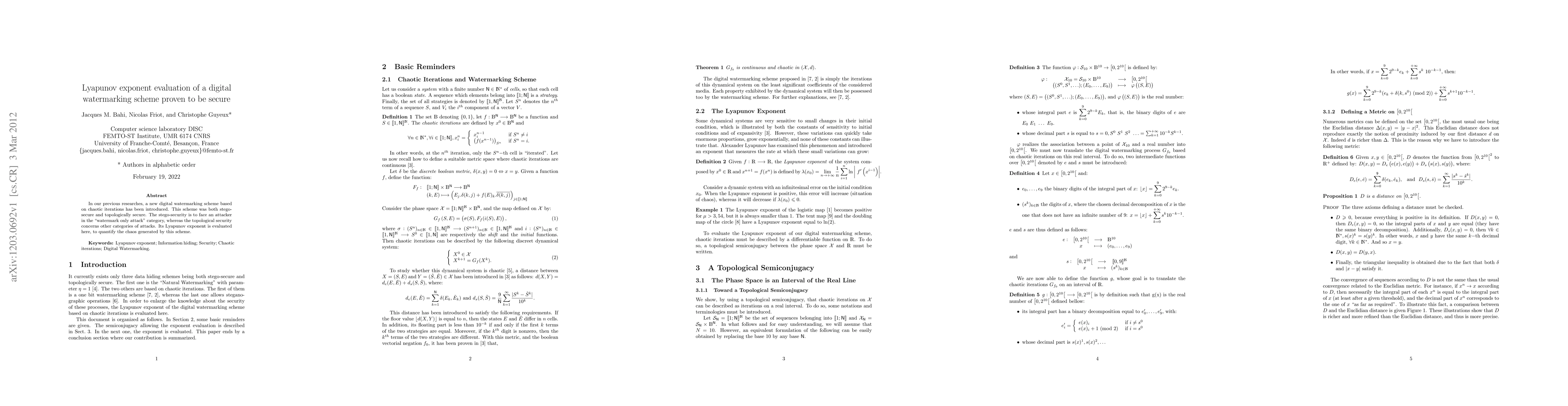 This paper evaluates the Lyapunov exponent of a newly proposed digital watermarking scheme based on chaotic iterations, assessing its chaos level and providing a measure of its security against various attack categories. The scheme's stego-security and topological security are confirmed through the analysis.