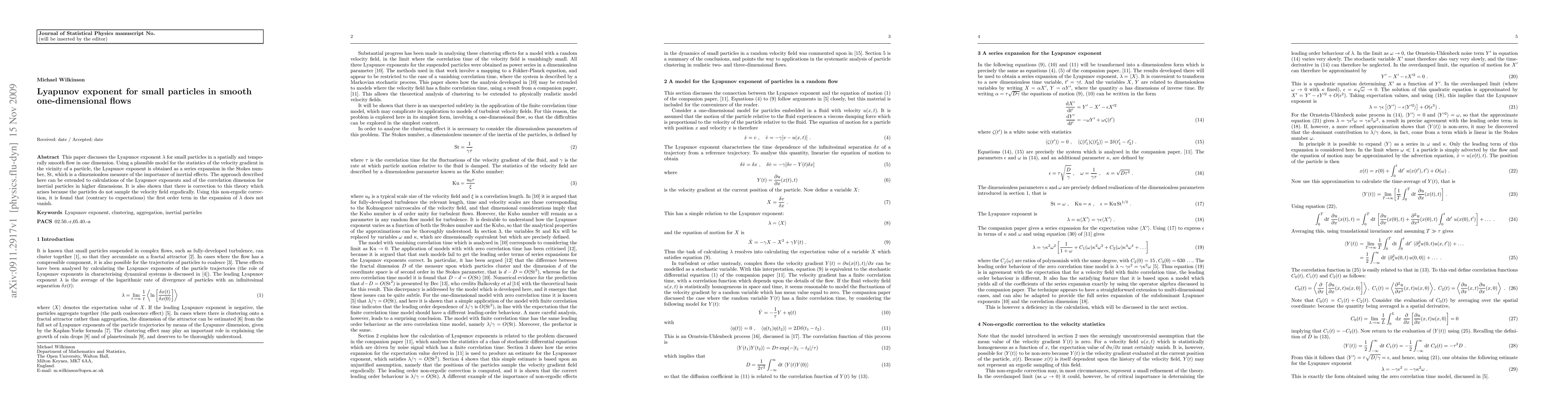 This paper derives the Lyapunov exponent for small particles in smooth one-dimensional flows, expanding it as a series in the Stokes number, and finds a non-ergodic correction that shows the first order term does not vanish, contrary to expectations. The method can be extended to higher dimensions.