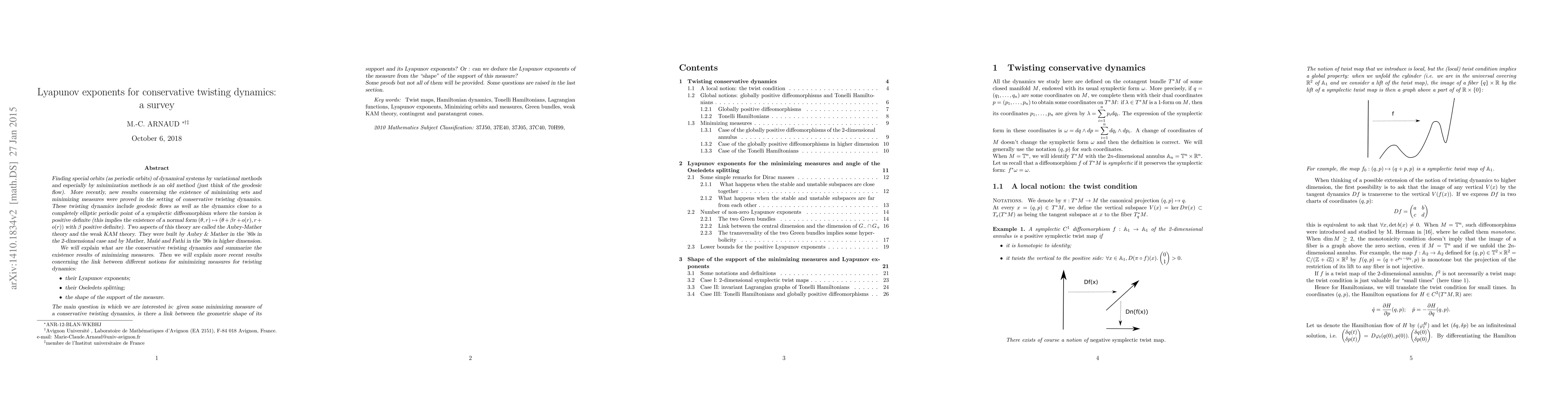 This paper surveys the existence and properties of minimizing measures in conservative twisting dynamics, focusing on Lyapunov exponents and their relation to the geometric shape of the support of these measures. It discusses Aubry-Mather and weak KAM theories, and explores whether the geometric shape of the support can determine the Lyapunov exponents of the measure.