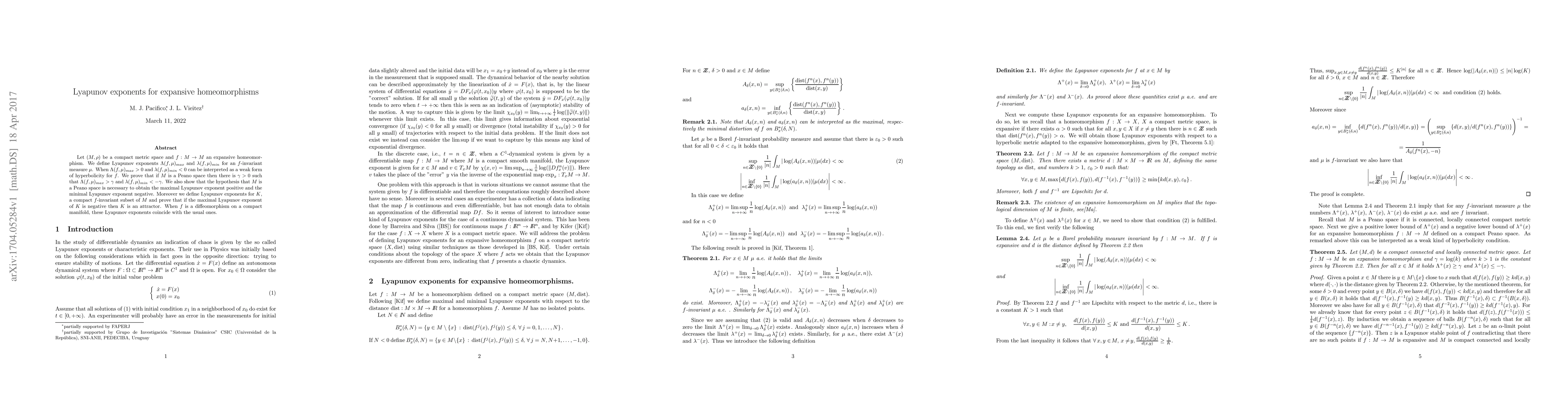 Let (M,d) be a compact metric space and f:M --> M an expansive homeomorphism. We define Lyapunov exponents L(f,m)_{max} and l(f,mu)_{min} for an f-invariant measure m. When L(f,m)_{max} > 0 and l(f,mu)_{min} < 0 can be interpreted as a weak form of hyperbolicity for f. We prove that if M is a Peano space then there is g>0 such that L(f,m)_{max} > g and l(f,m)_{min}< - g. We also show that the hypothesis that M is a Peano space is necessary to obtain the maximal Lyapunov exponent positive and the minimal Lyapunov exponent negative. Moreover we define Lyapunov exponents for K, a compact f-invariant subset of M and prove that if the maximal Lyapunov exponent of K is negative then K is an attractor. When f is a diffeomorphism on a compact manifold, these Lyapunov exponents coincide with the usual ones.