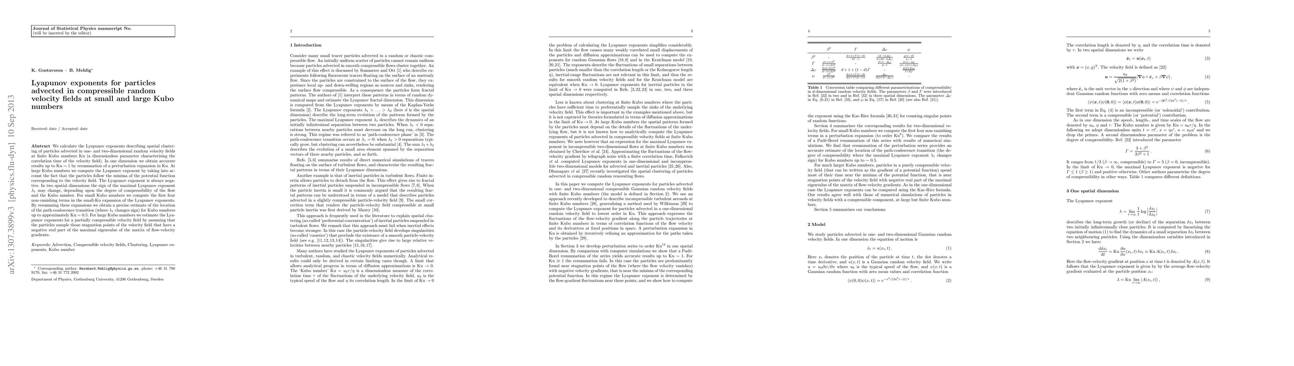 This paper calculates Lyapunov exponents for particles advected in compressible random velocity fields, finding they are always negative in one dimension. In two dimensions, the sign of the maximal Lyapunov exponent depends on compressibility and the Kubo number, with a transition point estimated for small Kubo numbers and a different approach for large Kubo numbers.