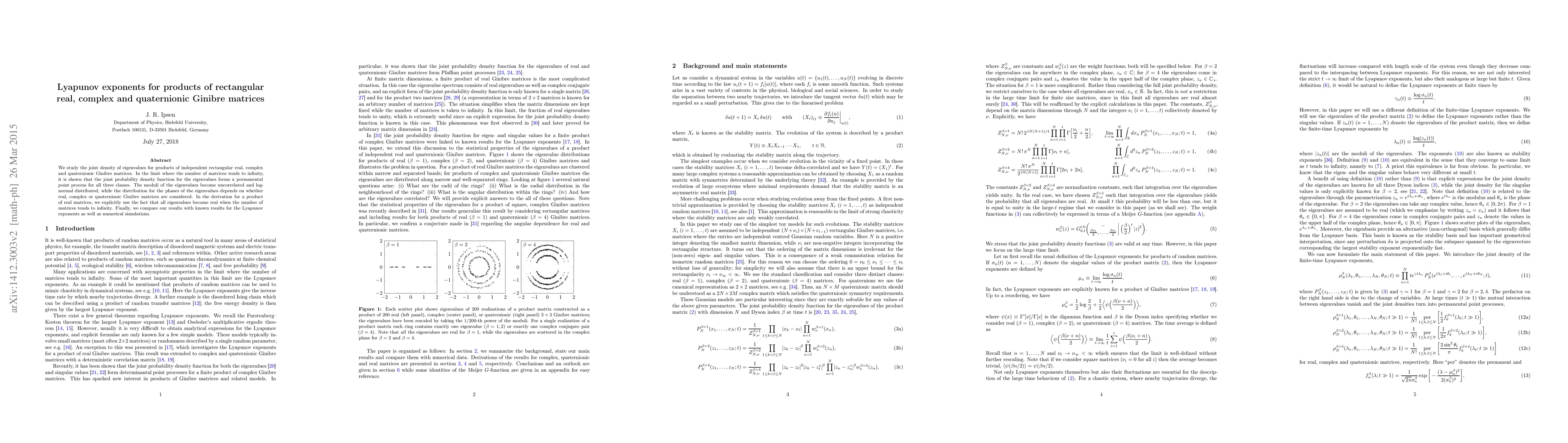 This paper investigates the joint density of eigenvalues for products of independent Ginibre matrices in real, complex, and quaternionic forms, showing that their moduli become log-normally distributed and uncorrelated in the large matrix limit. The phases' distribution varies by matrix type, and results are compared with known Lyapunov exponents and numerical simulations.