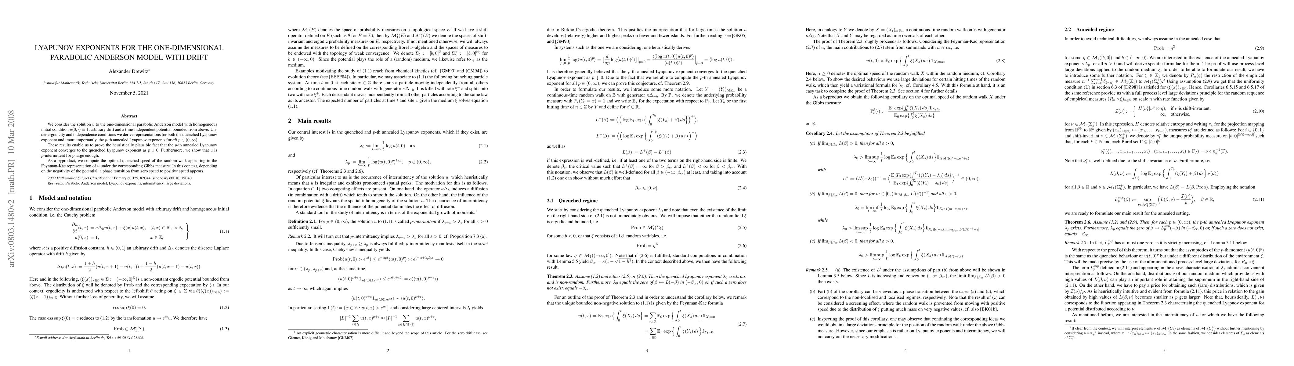 This paper derives representations for the Lyapunov exponents in the one-dimensional parabolic Anderson model with drift, proving the convergence of $p$-th annealed Lyapunov exponents to the quenched Lyapunov exponent as $p$ approaches zero. It also shows $p$-intermittency for large $p$ and computes the optimal quenched speed of the random walk, revealing a phase transition based on the potential's negativity.