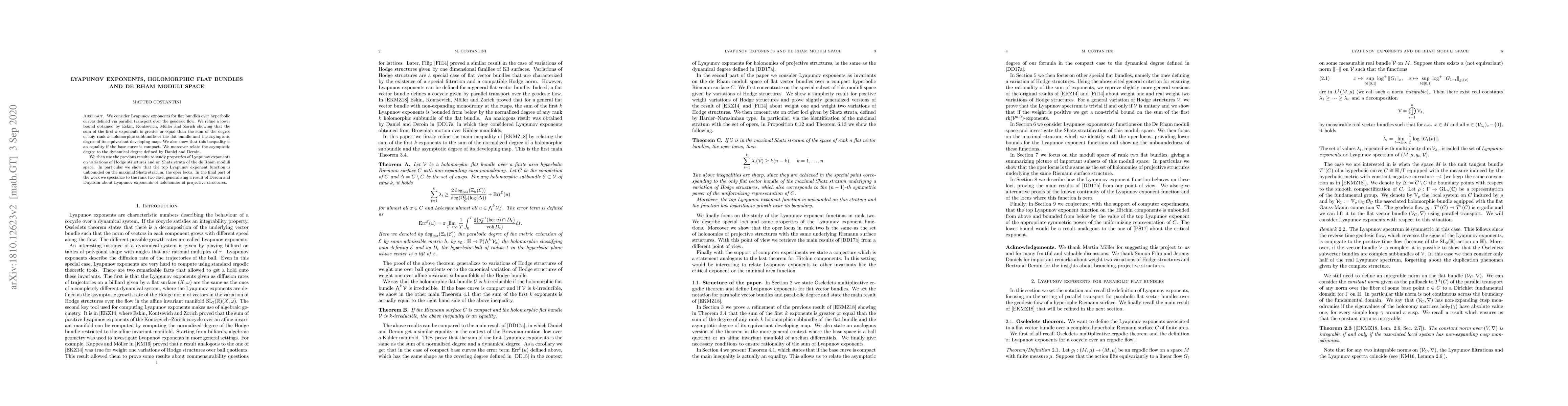 This paper refines the lower bound for Lyapunov exponents in flat bundles over hyperbolic curves, showing that the sum of the first k exponents is greater than or equal to the sum of the degree of any rank k holomorphic subbundle and the asymptotic degree of its equivariant developing map. It also establishes equality under compactness conditions and relates the asymptotic degree to the dynamical degree. The study extends to variations of Hodge structures and Shatz strata of the de Rham moduli space, proving the top Lyapunov exponent is unbounded on the maximal Shatz stratum.
