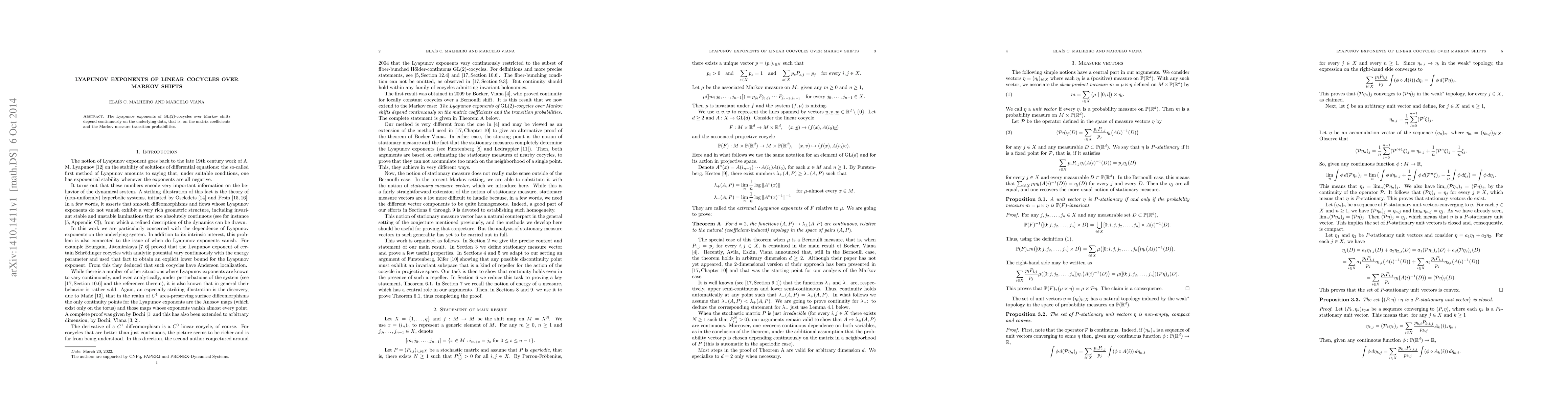 Summary: This paper investigates the Lyapunov exponents of linear cocycles over Markov shifts, demonstrating their continuous dependence on both the matrix coefficients and the transition probabilities of the Markov measure.