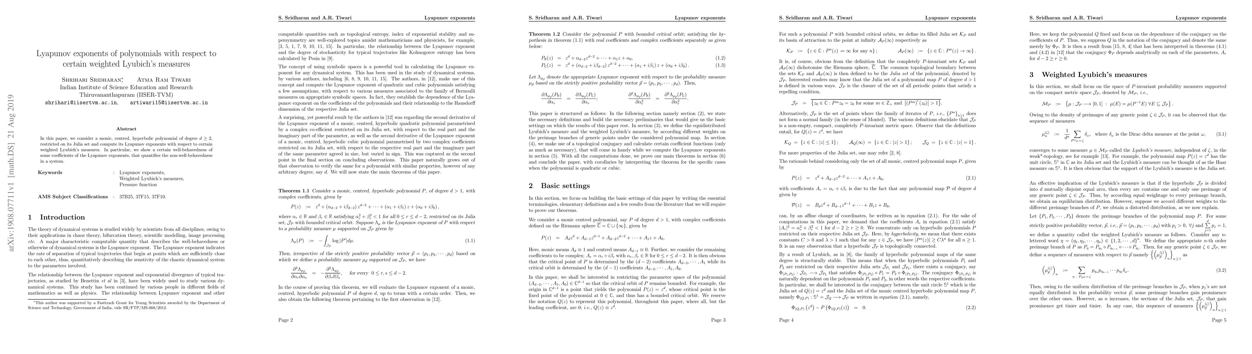This paper computes Lyapunov exponents for hyperbolic polynomials on their Julia sets using weighted Lyubich's measures, demonstrating the well-behavedness of certain coefficients of these exponents, which quantify the system's non-well-behavedness.