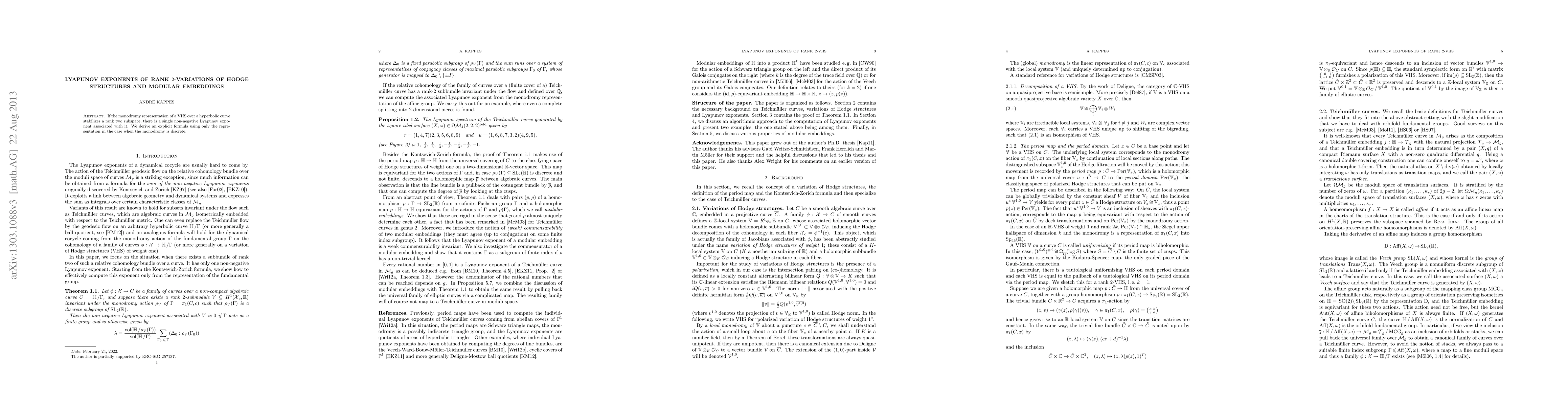 If the monodromy representation of a VHS over a hyperbolic curve stabilizes a rank two subspace, there is a single non-negative Lyapunov exponent associated with it. We derive an explicit formula using only the representation in the case when the monodromy is discrete.