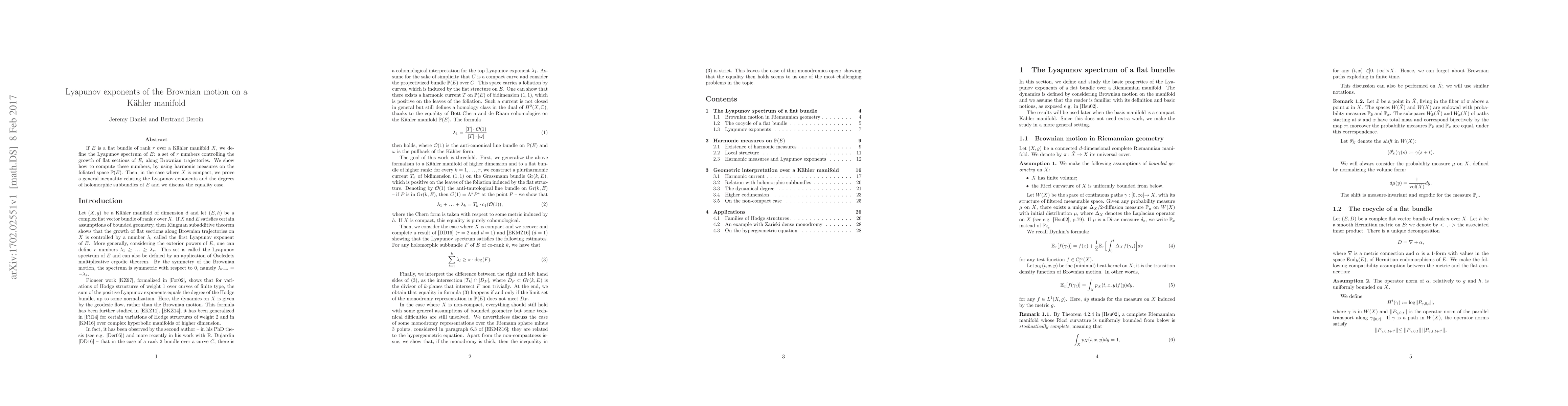 If E is a flat bundle of rank r over a K\"ahler manifold X, we define the Lyapunov spectrum of E: a set of r numbers controlling the growth of flat sections of E, along Brownian trajectories. We show how to compute these numbers, by using harmonic measures on the foliated space P(E). Then, in the case where X is compact, we prove a general inequality relating the Lyapunov exponents and the degrees of holomorphic subbundles of E and we discuss the equality case.