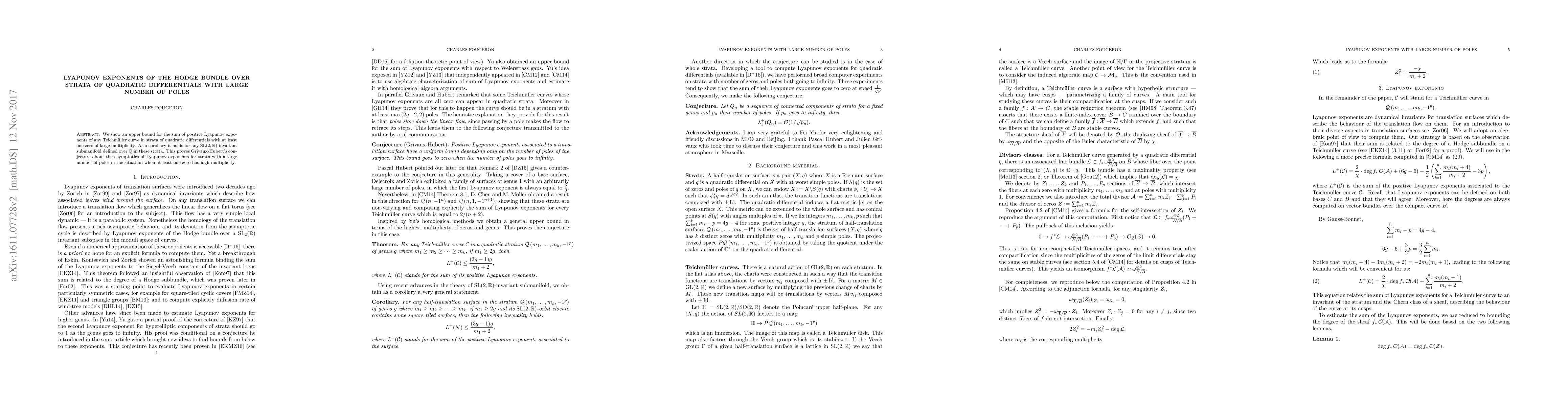 This paper establishes an upper bound for the sum of positive Lyapunov exponents along Teichmüller curves in strata of quadratic differentials with a large number of poles, particularly focusing on cases where at least one zero has significant multiplicity. This result confirms Grivaux-Hubert's conjecture regarding the asymptotic behavior of Lyapunov exponents in such strata.