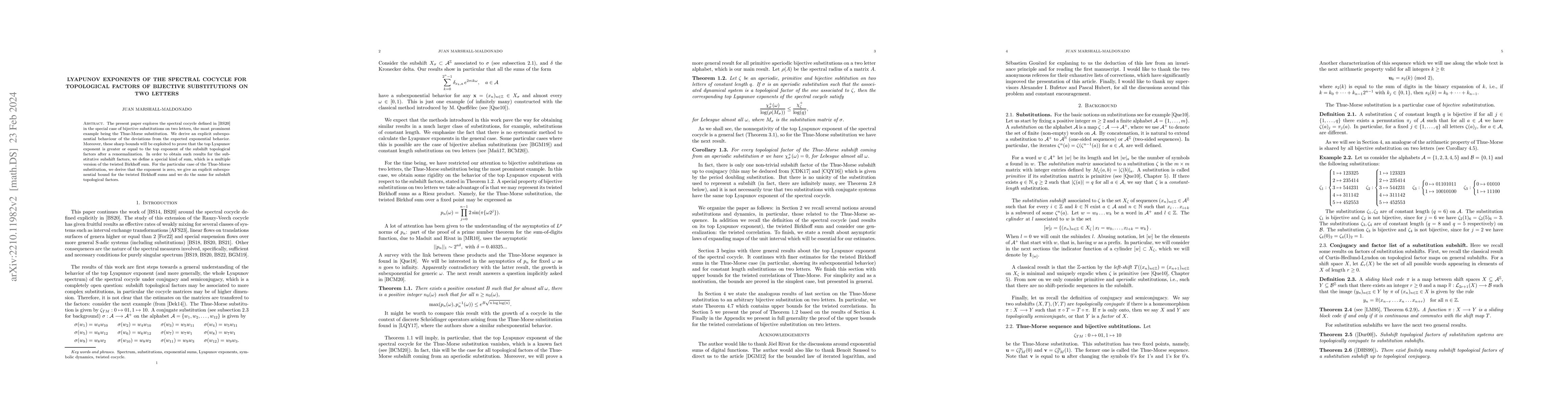 This paper investigates the spectral cocycle for bijective substitutions on two letters, deriving explicit subexponential bounds for deviations from expected exponential behavior. It proves that the top Lyapunov exponent is greater than or equal to the top exponent of the subshift topological factors post-renormalization, with special treatment for the Thue-Morse substitution yielding an exponent of zero.