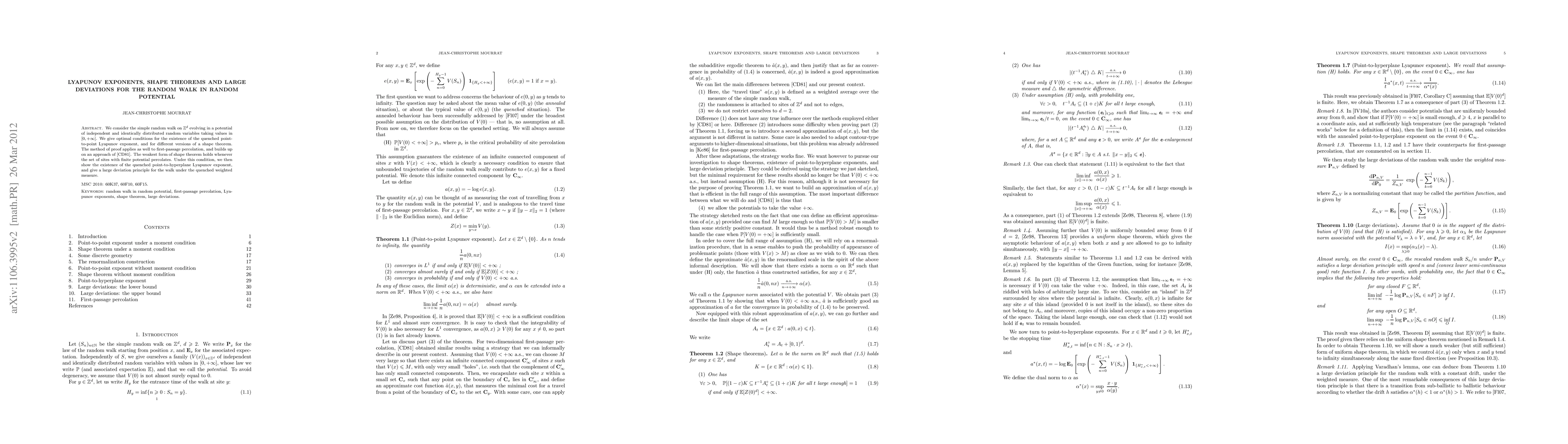 We consider the simple random walk on Z^d evolving in a potential of independent and identically distributed random variables taking values in [0, + \infty]. We give optimal conditions for the existence of the quenched point-to-point Lyapunov exponent, and for different versions of a shape theorem. The method of proof applies as well to first-passage percolation, and builds up on an approach of Cox and Durrett (1981). The weakest form of shape theorem holds whenever the set of sites with finite potential percolates. Under this condition, we then show the existence of the quenched point-to-hyperplane Lyapunov exponent, and give a large deviation principle for the walk under the quenched weighted measure.
