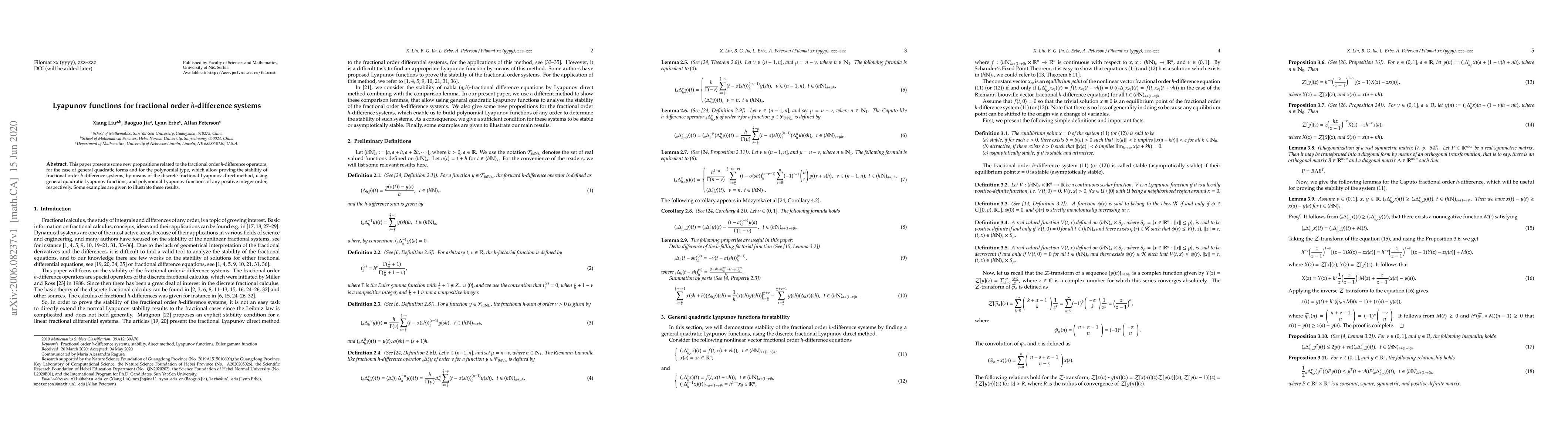This paper presents some new propositions related to the fractional order $h$-difference operators, for the case of general quadratic forms and for the polynomial type, which allow proving the stability of fractional order $h$-difference systems, by means of the discrete fractional Lyapunov direct method, using general quadratic Lyapunov functions, and polynomial Lyapunov functions of any positive integer order, respectively. Some examples are given to illustrate these results.